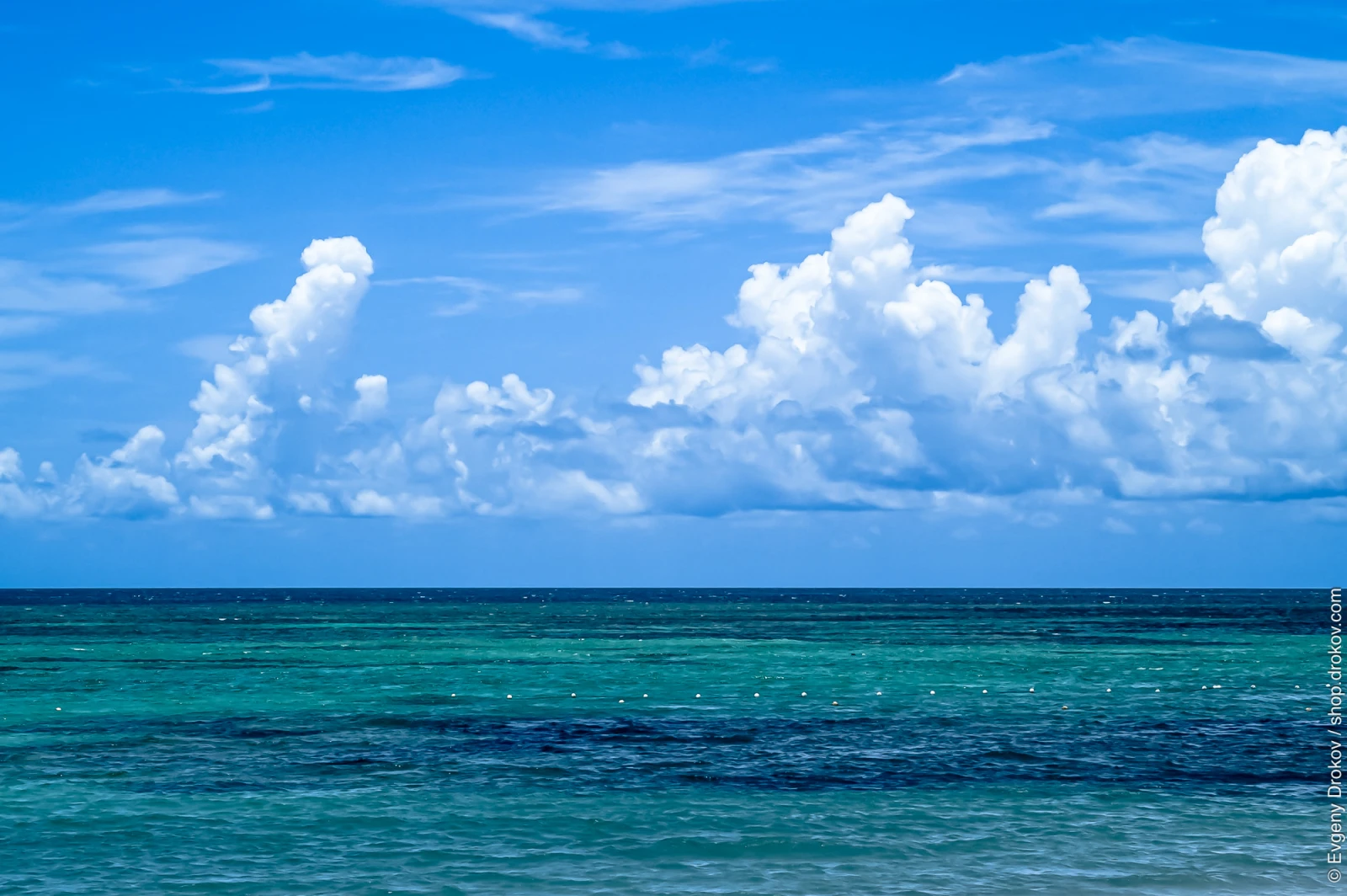 A vast expanse of the turquoise sea meets a vibrant blue sky dotted with puffy white clouds. Several buoys mark the water's surface, indicating a designated area. This tranquil vista was captured in Punta Cana, Bavaro, Dominican Republic, showcasing the region's breathtaking natural beauty.
