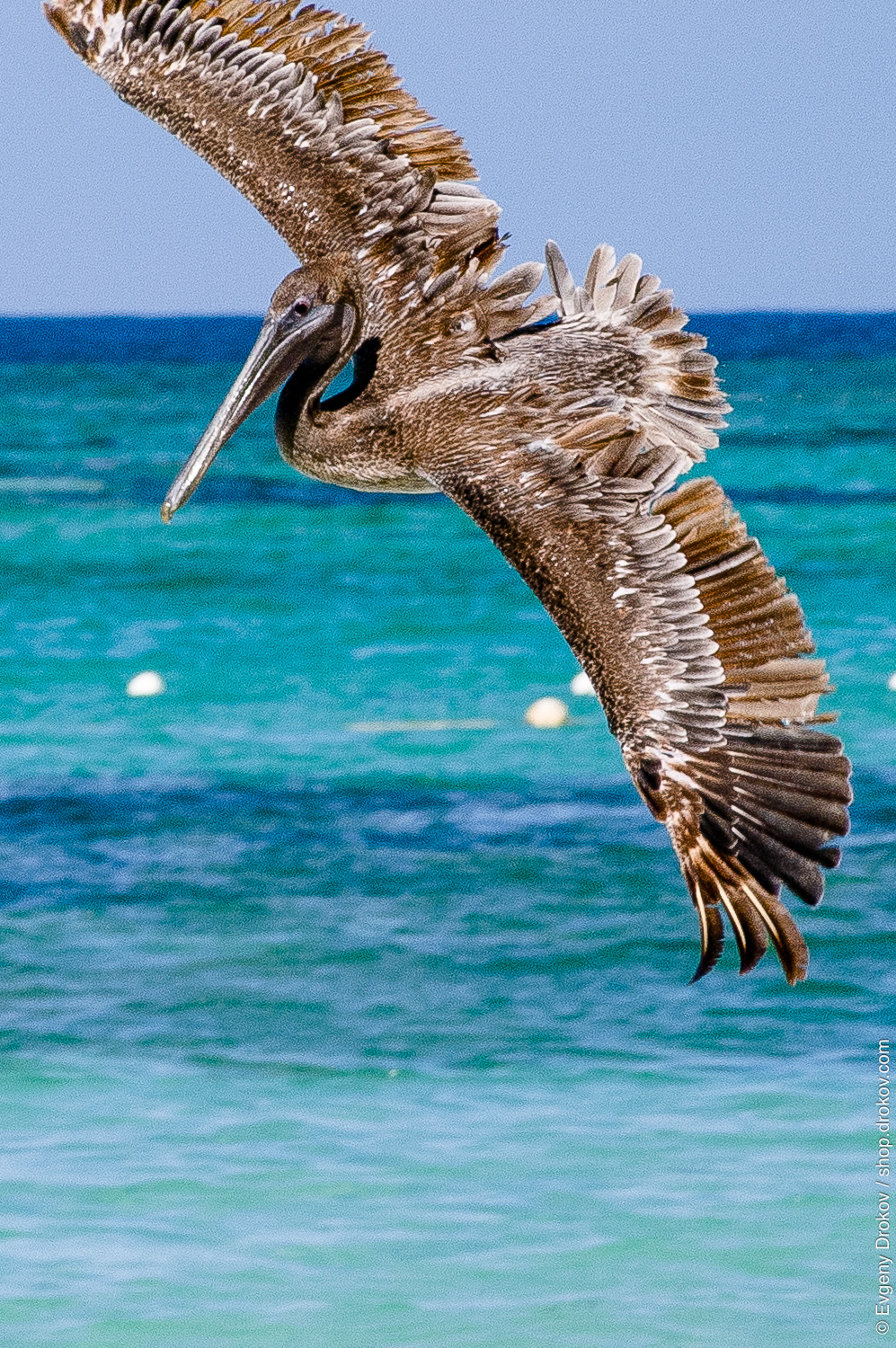A brown pelican is captured mid-flight, wings fully extended, as it hunts for fish above the vibrant turquoise waters. This dynamic moment showcases the pelican's predatory instinct in its natural habitat.