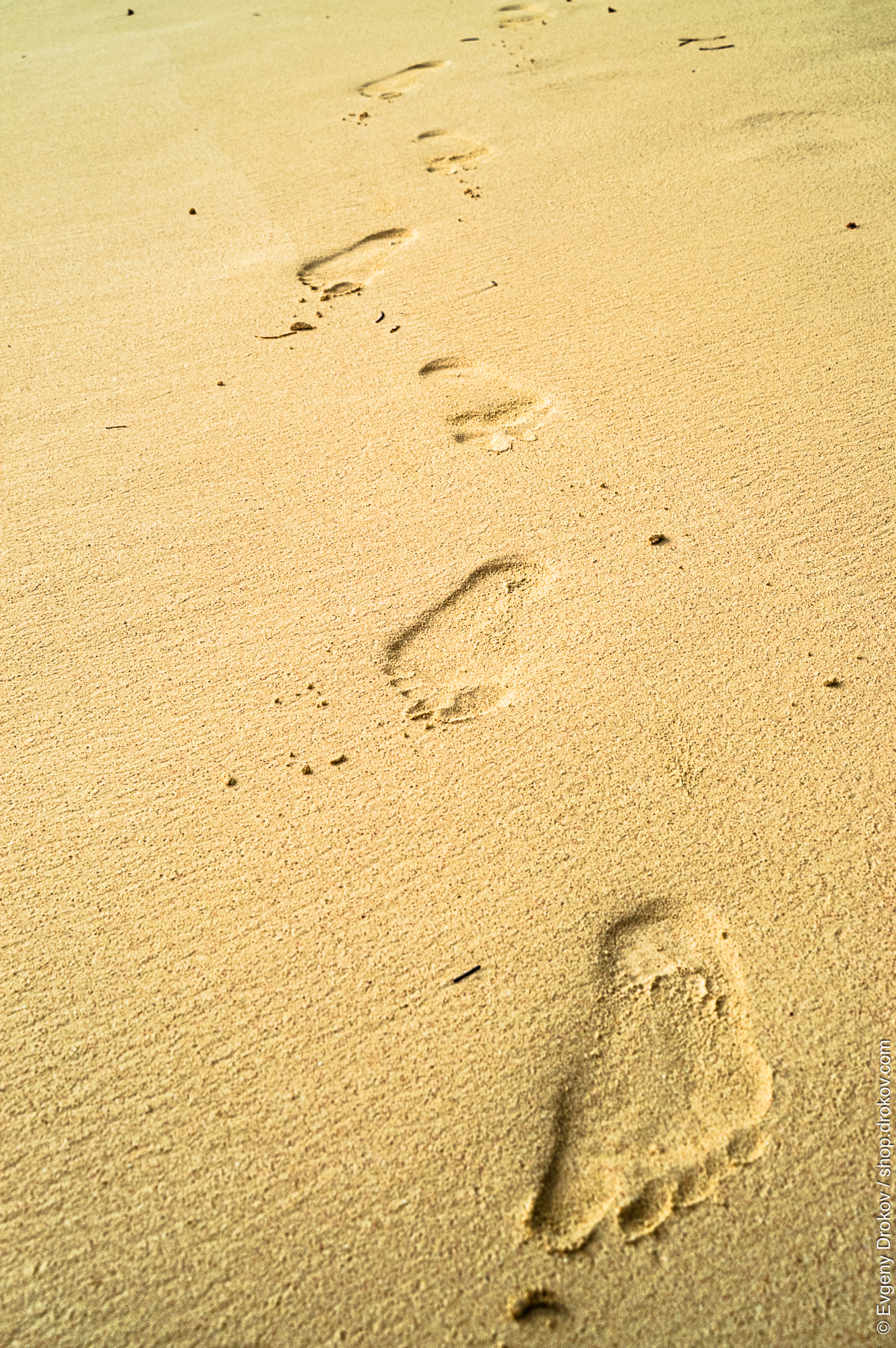Footprints mark a solitary walk along the sandy shores of Punta Cana, Bavaro, Dominican Republic. The impressions are the direct result of a person traversing the beach.