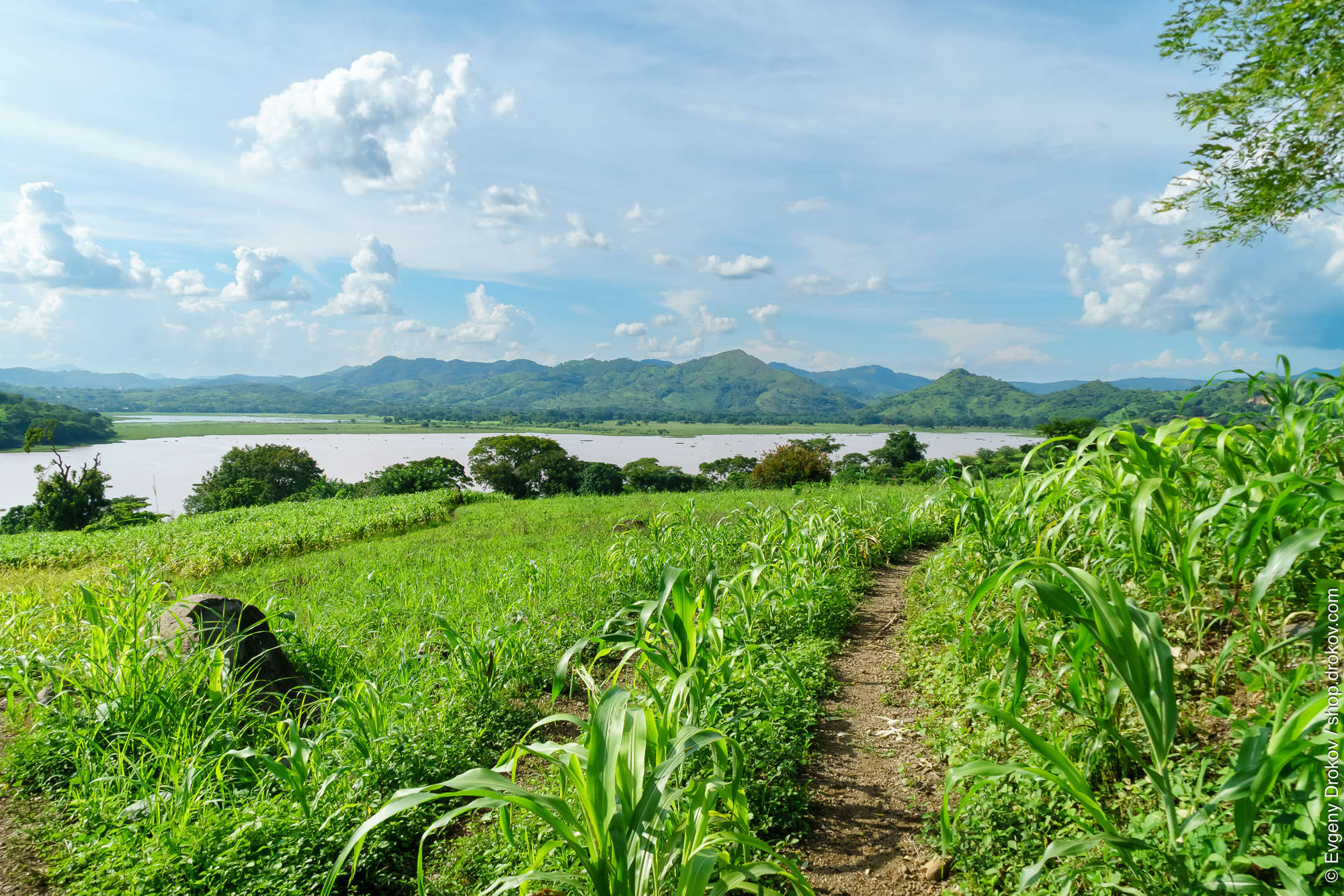 A vibrant cornfield in Metapan, Santa Ana, El Salvador, captures the essence of rural life in October 2015. The lush green stalks, a testament to the fertile land, lead the eye towards a serene lake and rolling hills under a dynamic sky. This composition highlights the beauty of agricultural landscapes and the tranquility of nature.