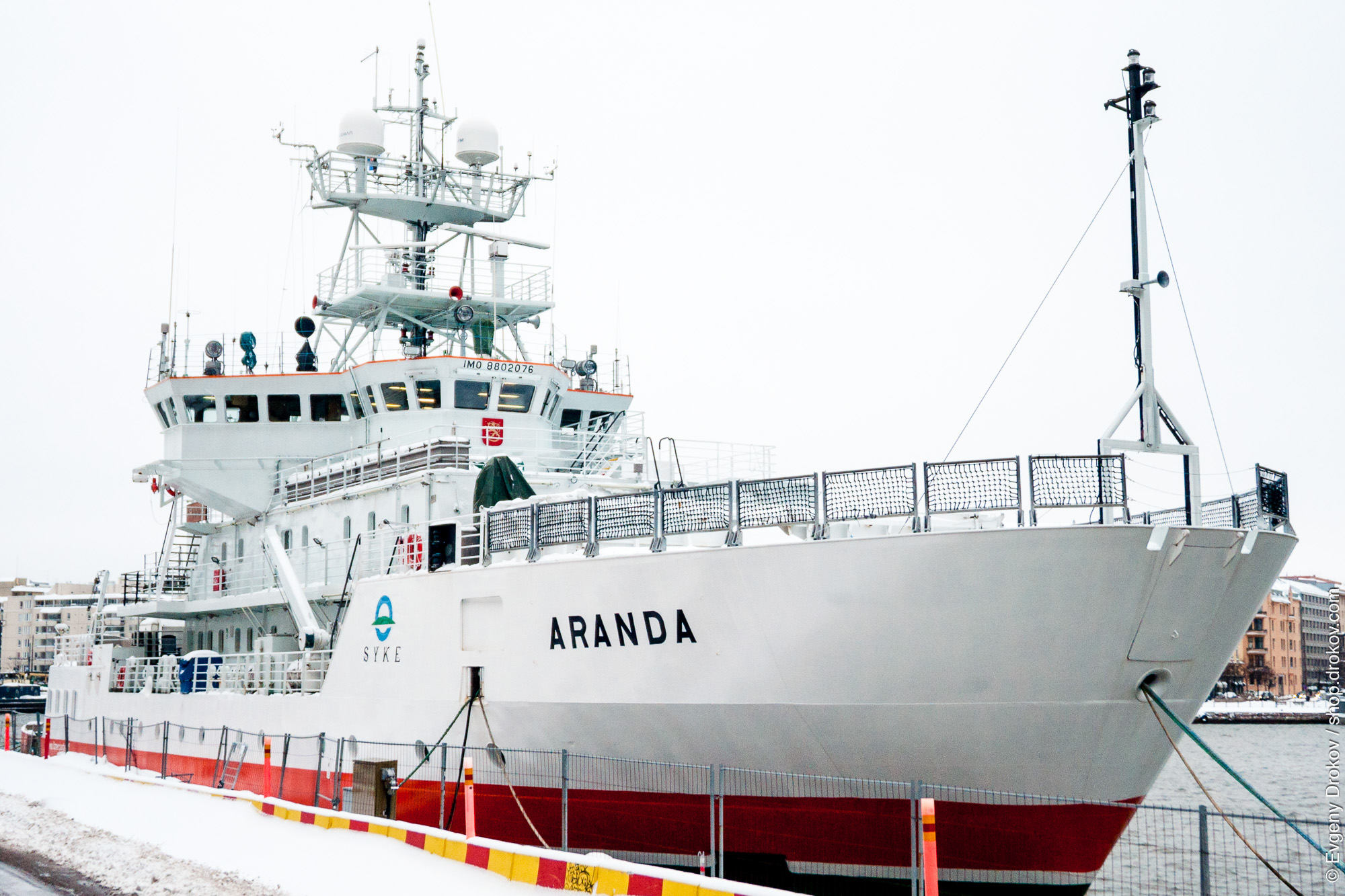 The research vessel ARANDA is docked in Helsinki, Finland during winter. This vessel is operated by the Finnish Environment Institute (SYKE) for marine research and environmental monitoring.