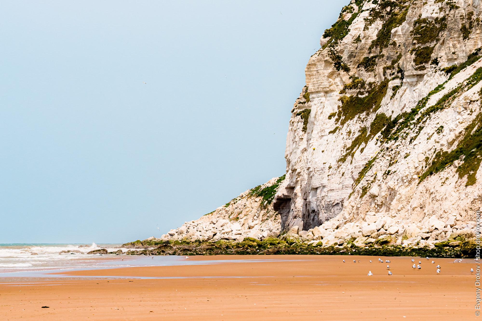 Seagulls gather on the sandy shore of the La Manche near Calais, France. The dramatic white cliffs, a signature of the region, provide a stunning backdrop to this coastal vista.