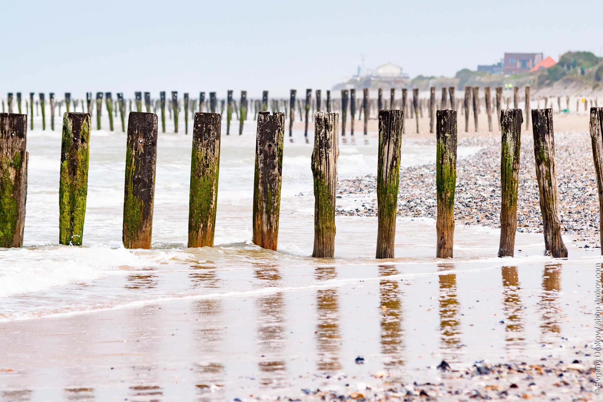 Wooden groynes stand firm against the incoming tide on the beach near Calais, France. These structures are essential for coastal defense, protecting the shoreline from erosion.