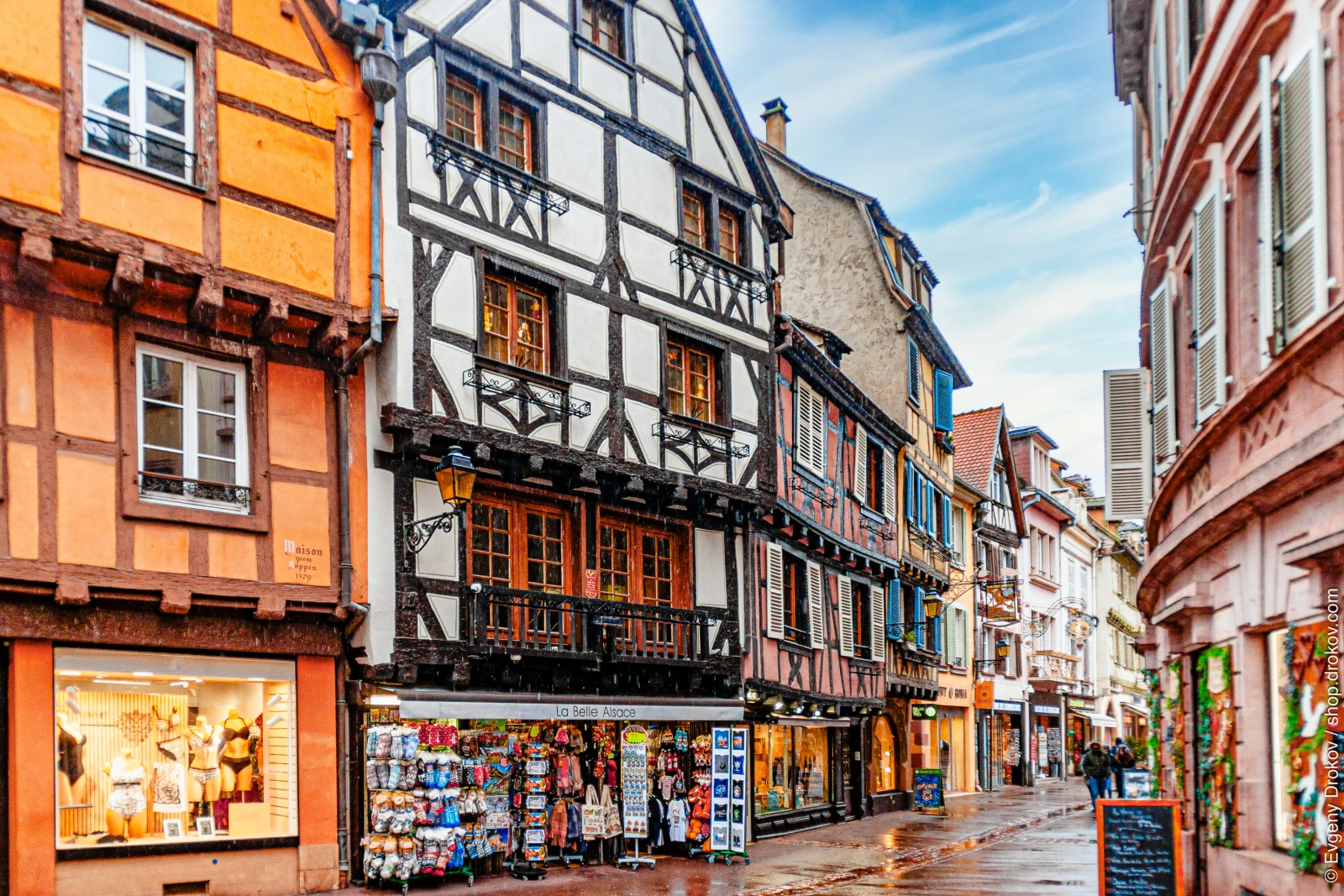 This is a street in Colmar, Alsace, France, showcasing traditional half-timbered architecture. The shops display a variety of goods, from lingerie to souvenirs, inviting exploration of this historic European town.