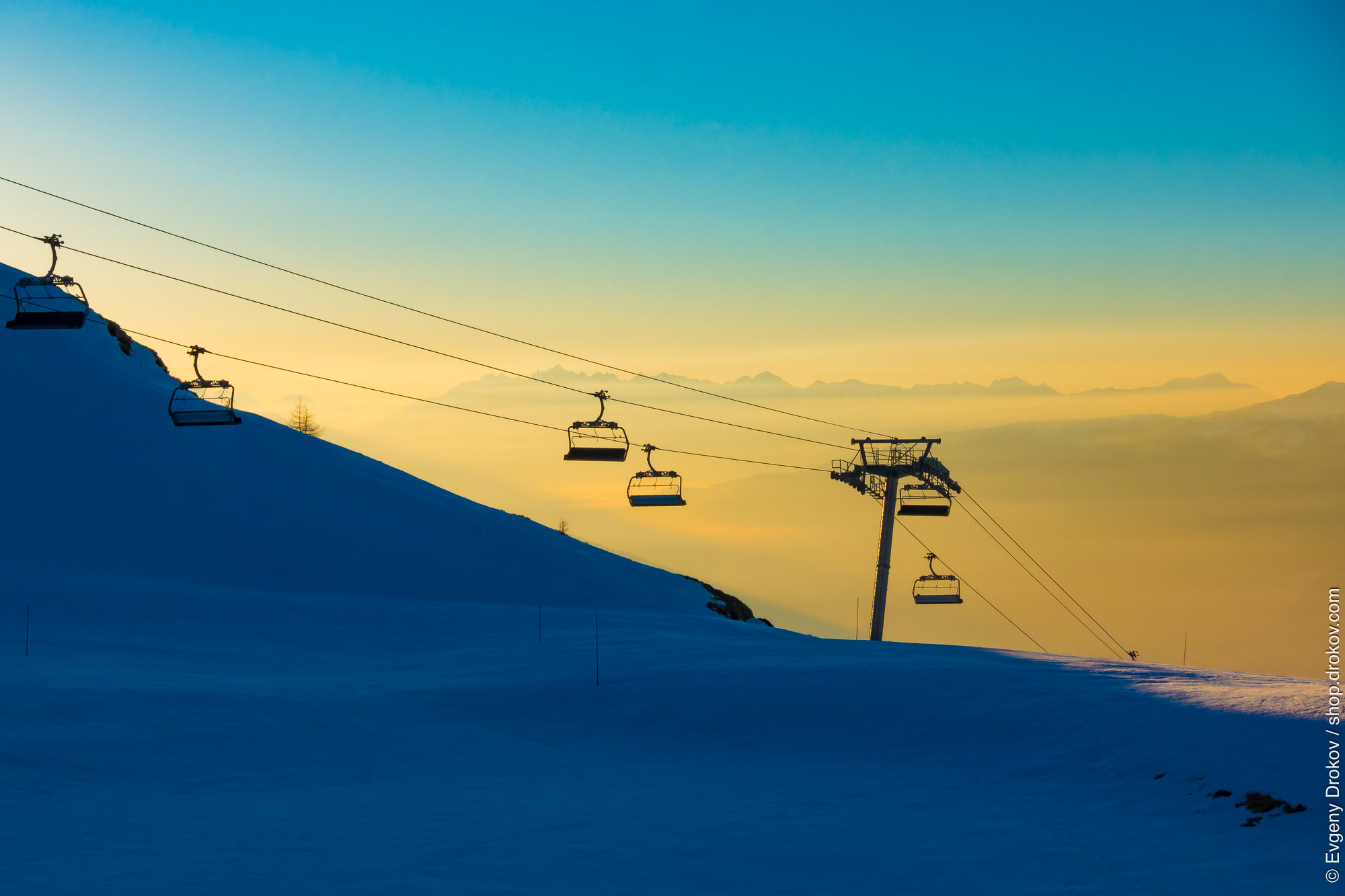 In Les Arcs, Savoie, France, January 2017, chairlifts ascend a snow-covered mountain against a vibrant sunset. This captures the essence of a ski resort at dusk, showcasing the transition from day to night in a breathtaking alpine setting.
