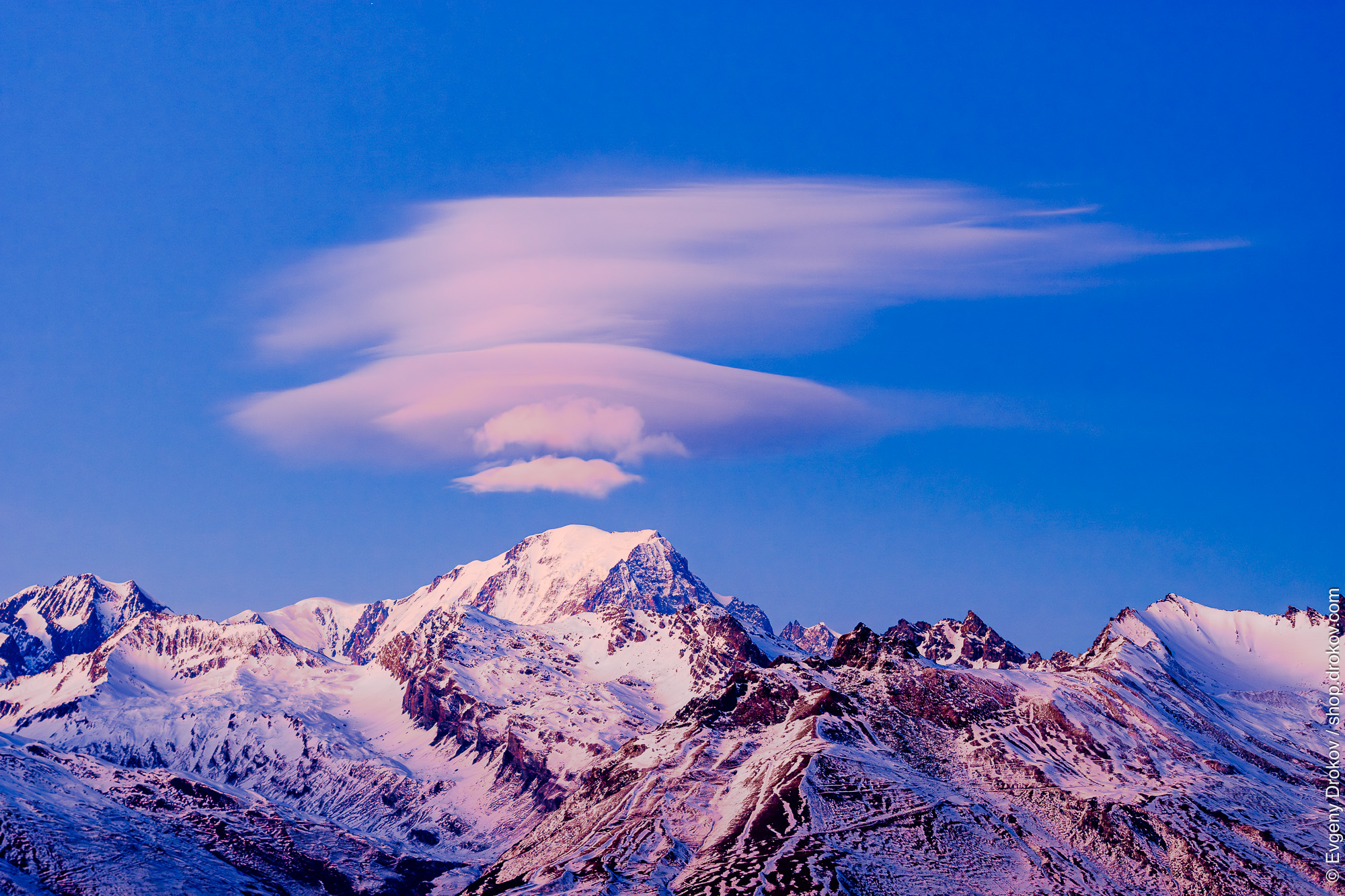 A majestic mountain range in Les Arcs, France, bathed in the soft hues of dawn or dusk. The snow-capped peaks stand in stark contrast to the vibrant blue sky, adorned with a striking lenticular cloud formation. This capture showcases the raw beauty and dramatic atmosphere of the French Alps in January 2017.