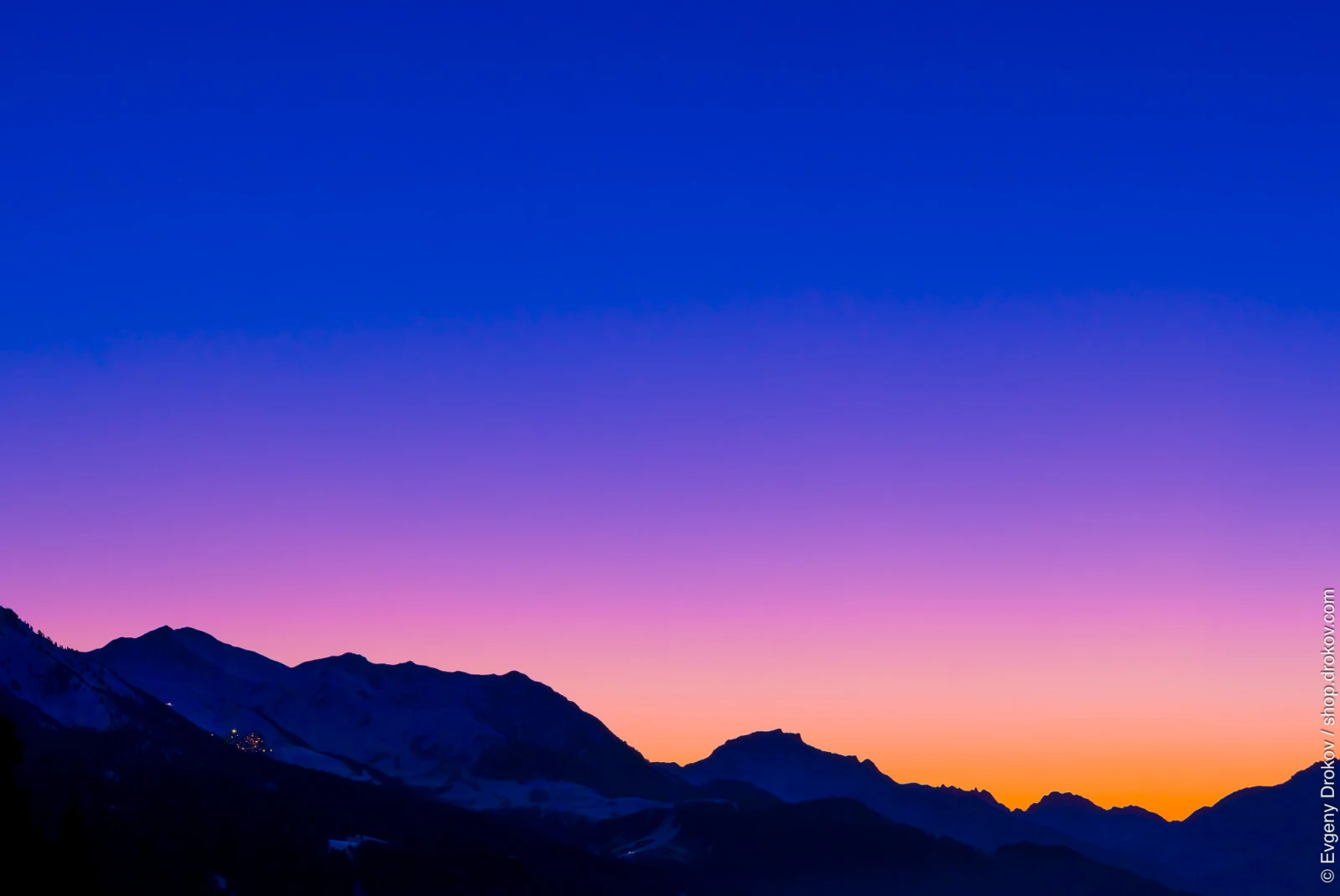 The majestic peaks of Les Arcs, France, are silhouetted against a vibrant twilight sky in January 2017. This striking natural display captures the serene beauty of the Savoie region as day transitions to night.
