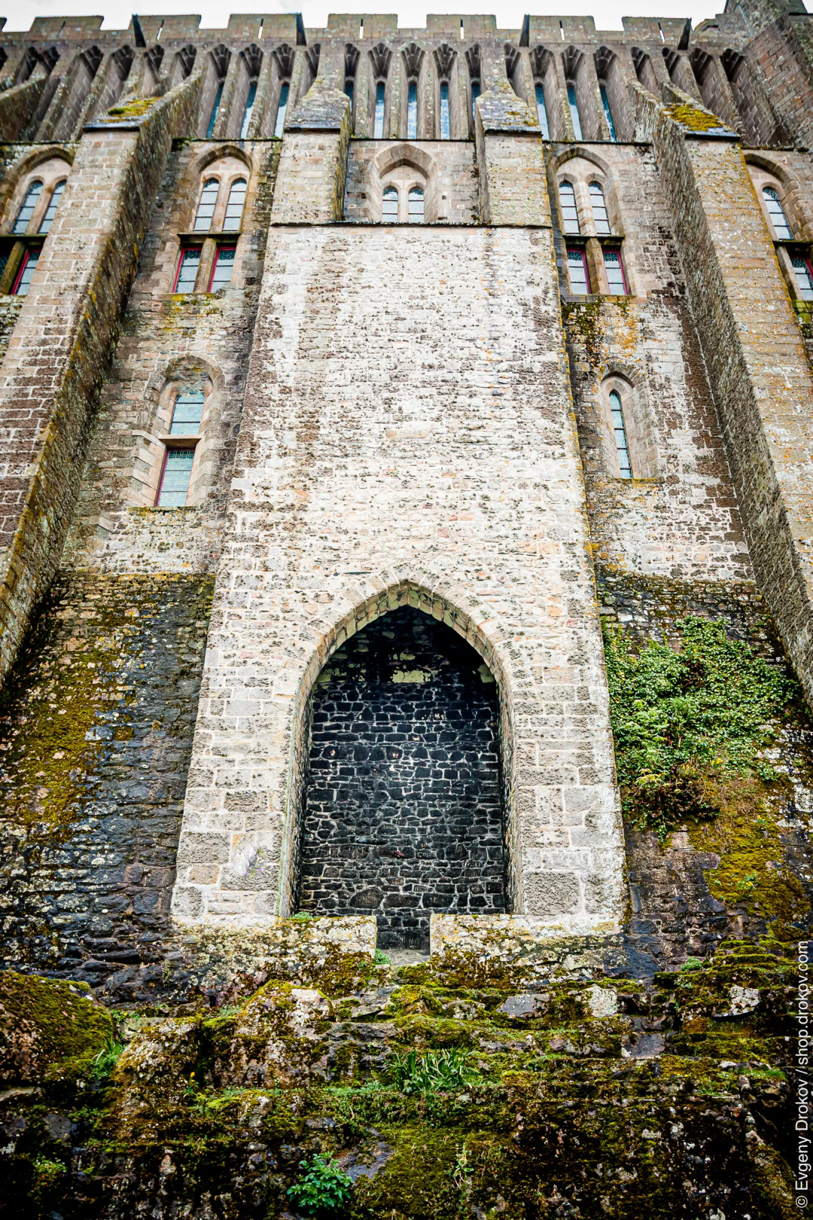 This is a low-angle perspective of the imposing stone facade of Mont Saint-Michel Abbey. The ancient architecture, weathered by time and adorned with moss, stands as a testament to centuries of history and religious significance.