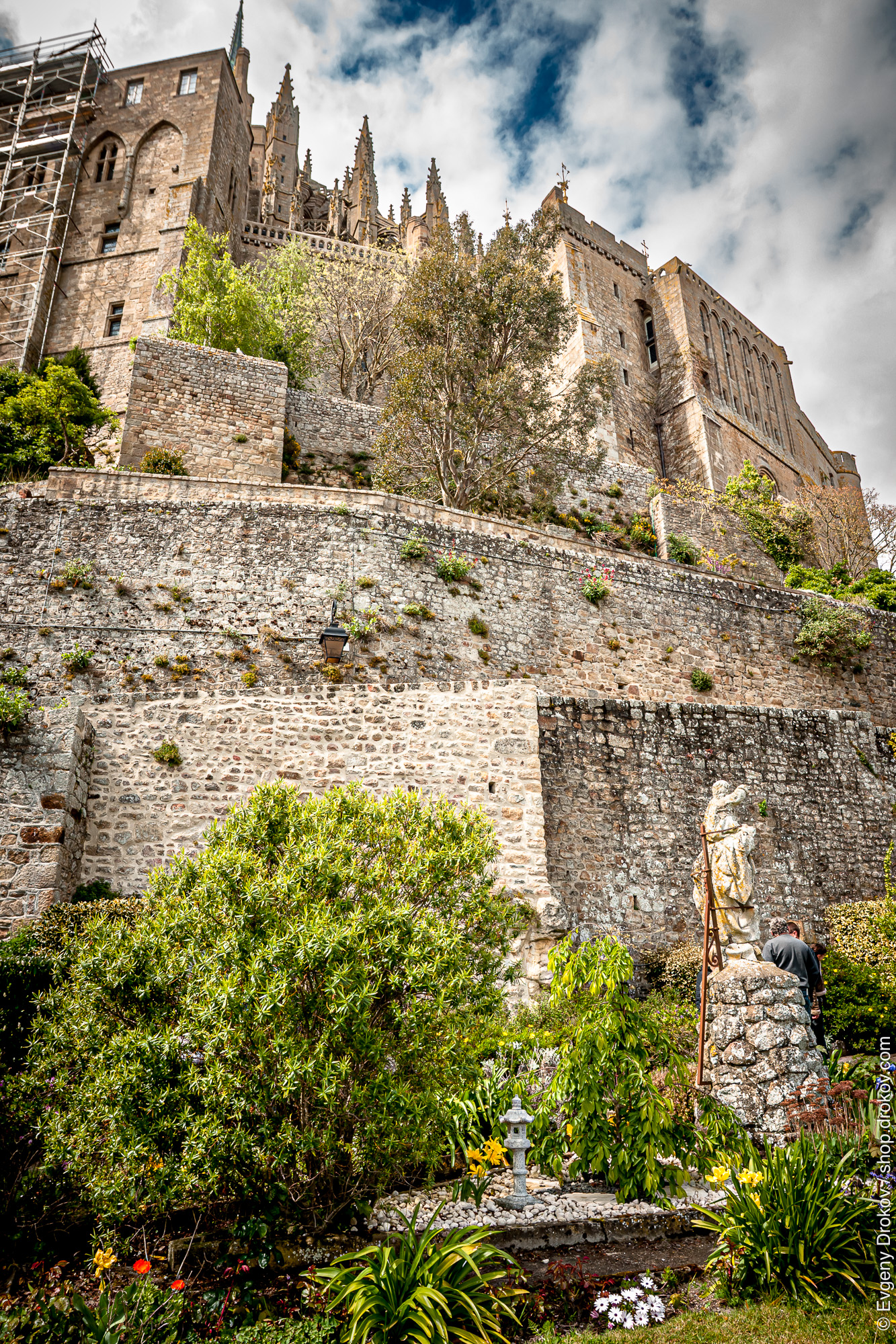 A man stands near a statue at the base of Mont Saint-Michel in Lower Normandy, France. This iconic tidal island abbey is a UNESCO World Heritage site, drawing visitors to its historical and architectural grandeur.