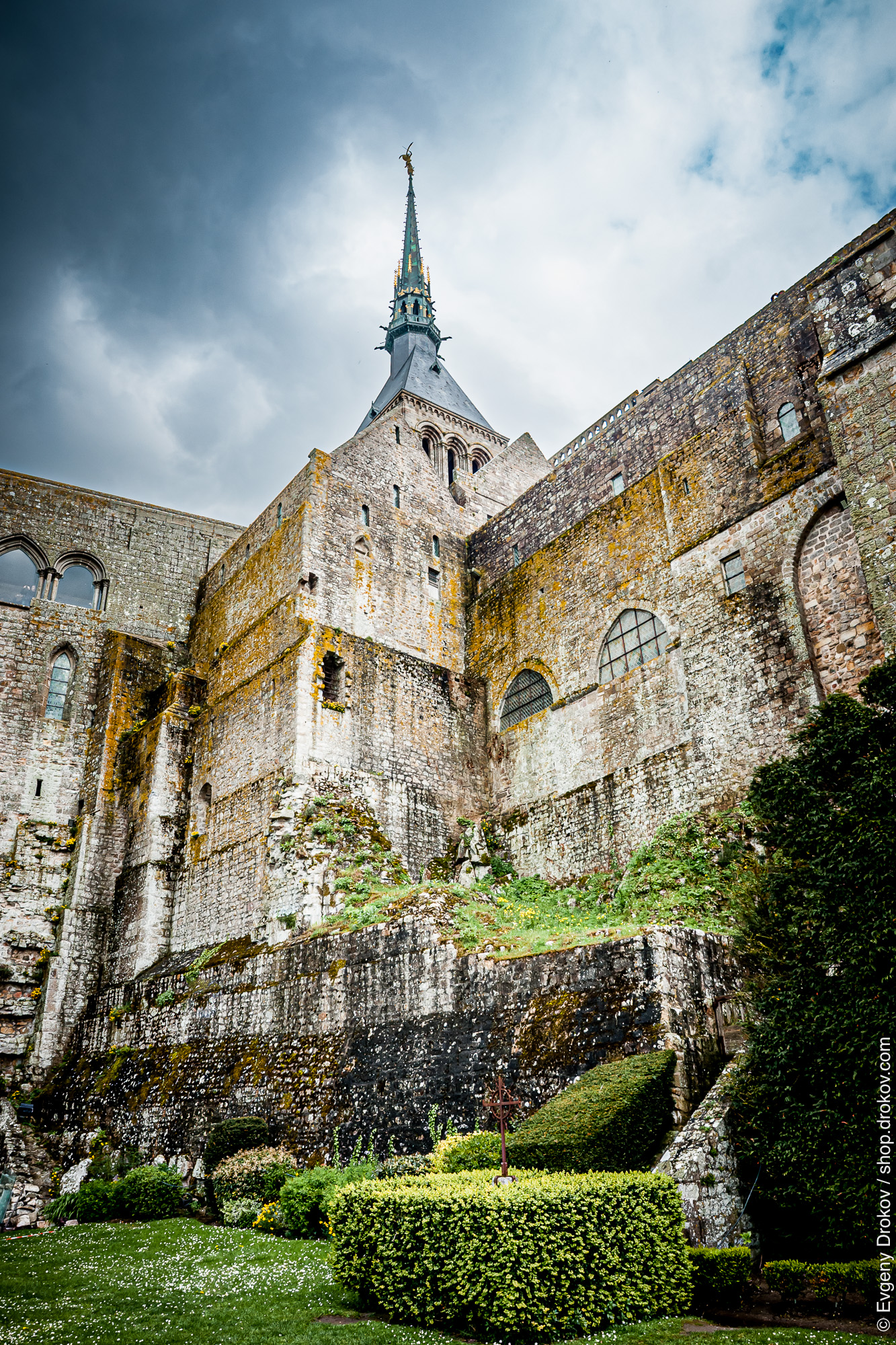 This is a view of the historic Mont Saint-Michel abbey in Lower Normandy, France. The imposing stone structure, with its weathered facade and soaring spire, stands as a testament to centuries of architectural and religious significance. The dramatic sky above emphasizes its enduring presence.