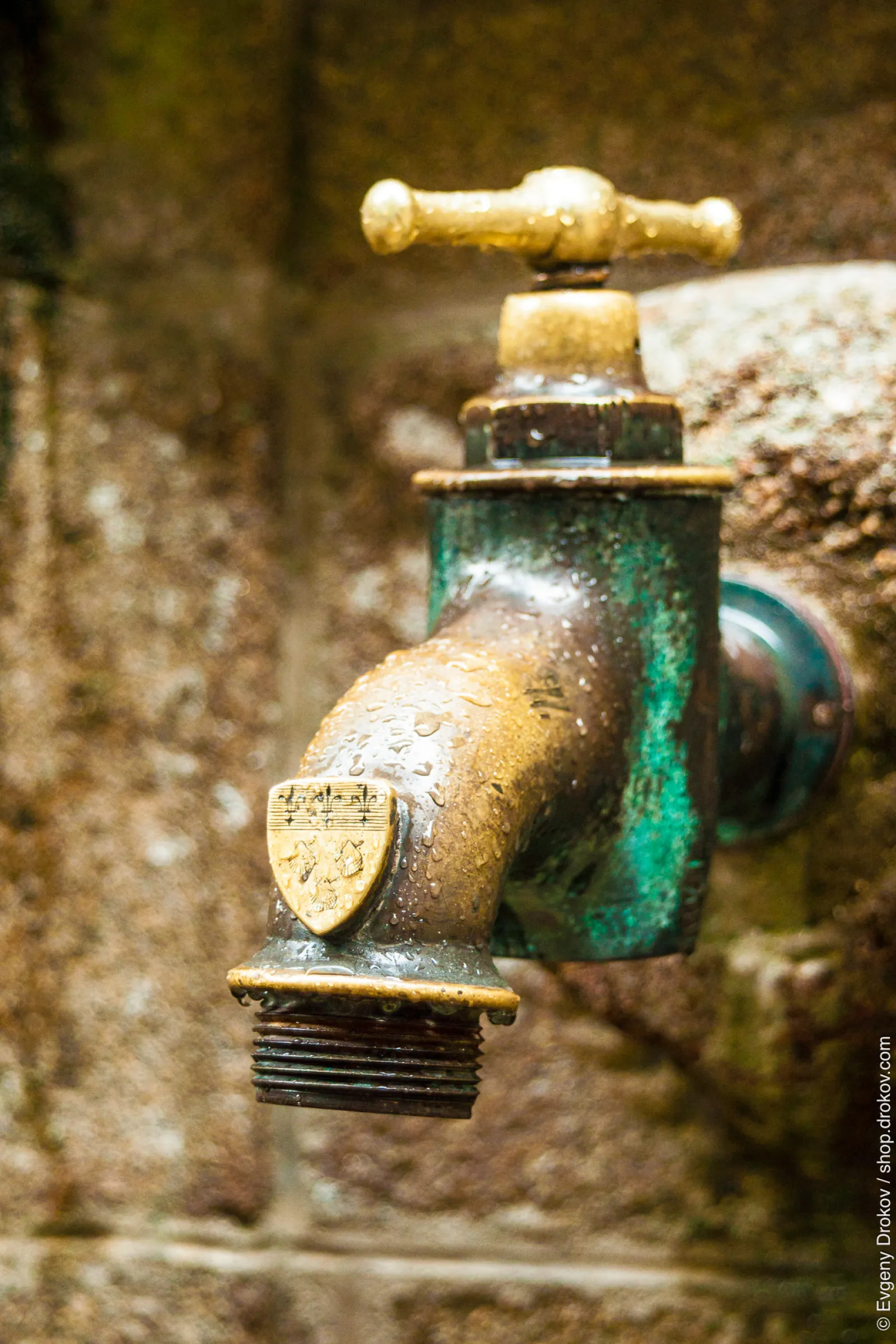 This is a close-up of a weathered brass faucet, adorned with a crest featuring fleur-de-lis and scallops, located at Mont Saint-Michel, Lower Normandy, France. The water droplets clinging to the metal highlight its age and the atmospheric conditions of this historic tidal island.