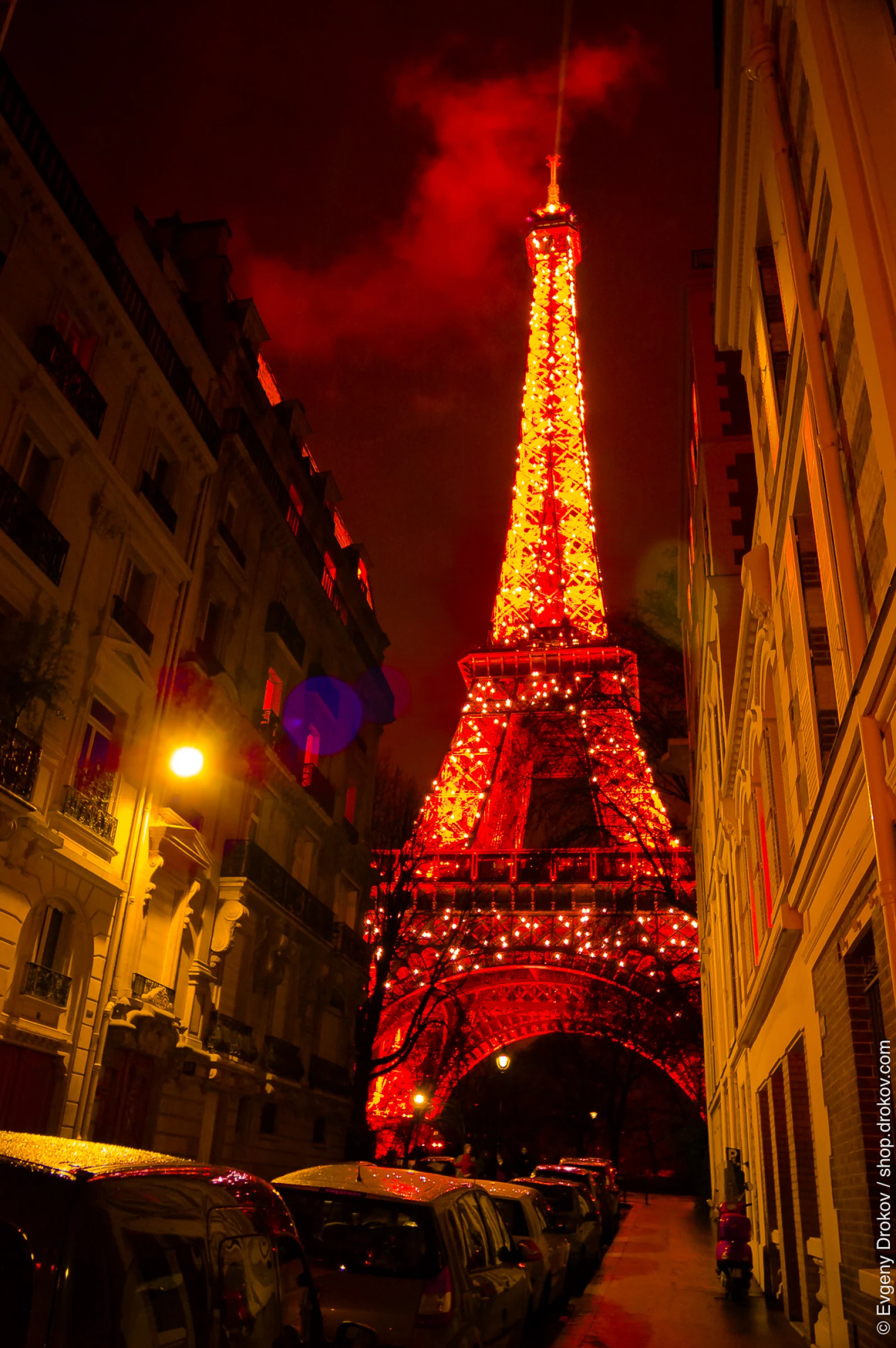 The Eiffel Tower, adorned with vibrant red and yellow lights, stands tall against the Parisian night sky. Buildings line the street, and parked cars are visible. The warm tones and festive lighting create a captivating scene.