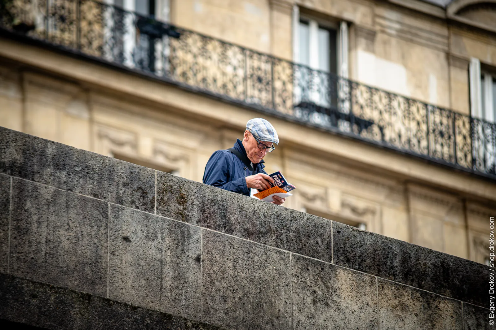 A man in Paris, France, reads a guide to the city while standing on the banks of the Seine. He is engrossed in planning his exploration of the iconic Parisian landmarks.