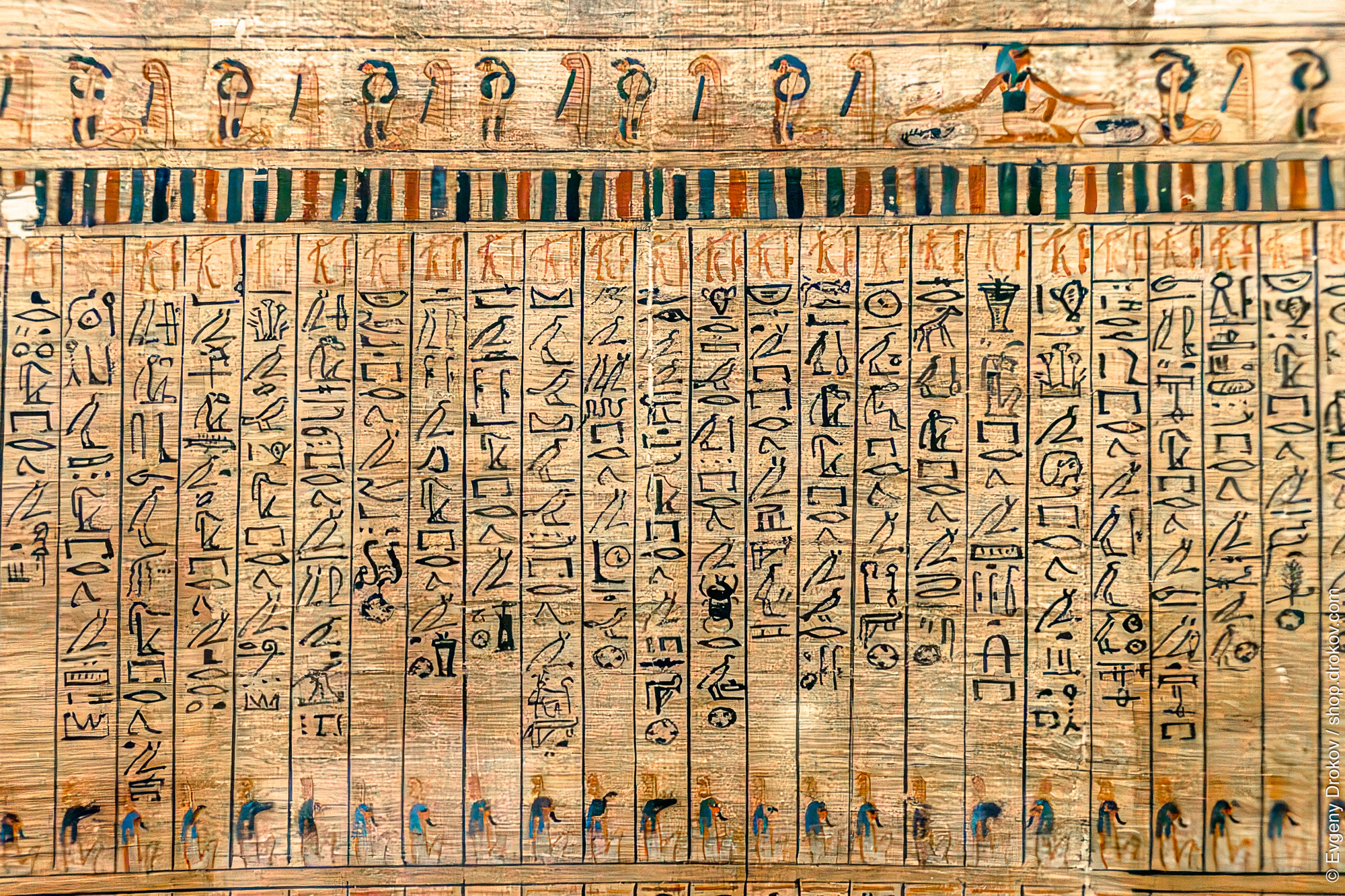 This is an ancient Egyptian papyrus from the Louvre collection, Paris, France. It displays hieroglyphs and figures, likely detailing religious texts or funerary rites.