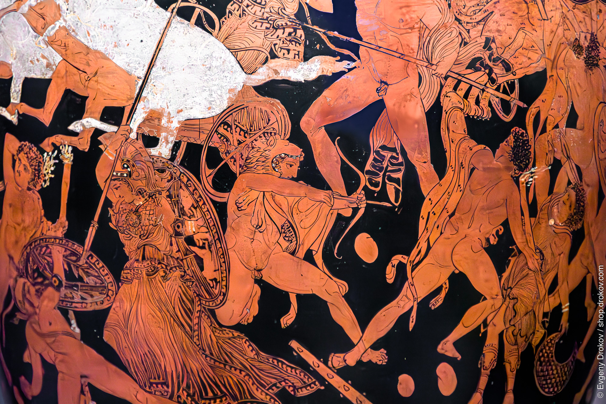 This detail from the Louvre collection in Paris, France, showcases an ancient Greek vase depicting a dynamic battle scene. The intricate red-figure pottery captures the intensity of combat, preserving a moment of historical artistry for all to admire.
