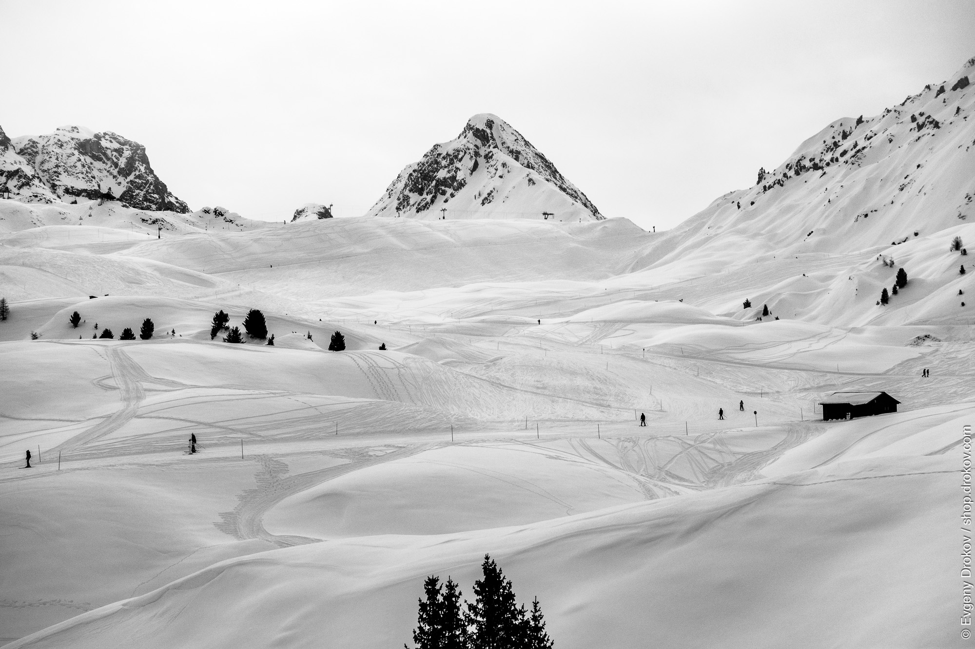 Skiers navigate the pristine slopes of La Plagne Mountains in Savoie, France. This expansive winter landscape captures the thrill of the sport against a backdrop of majestic peaks and a vast sky.