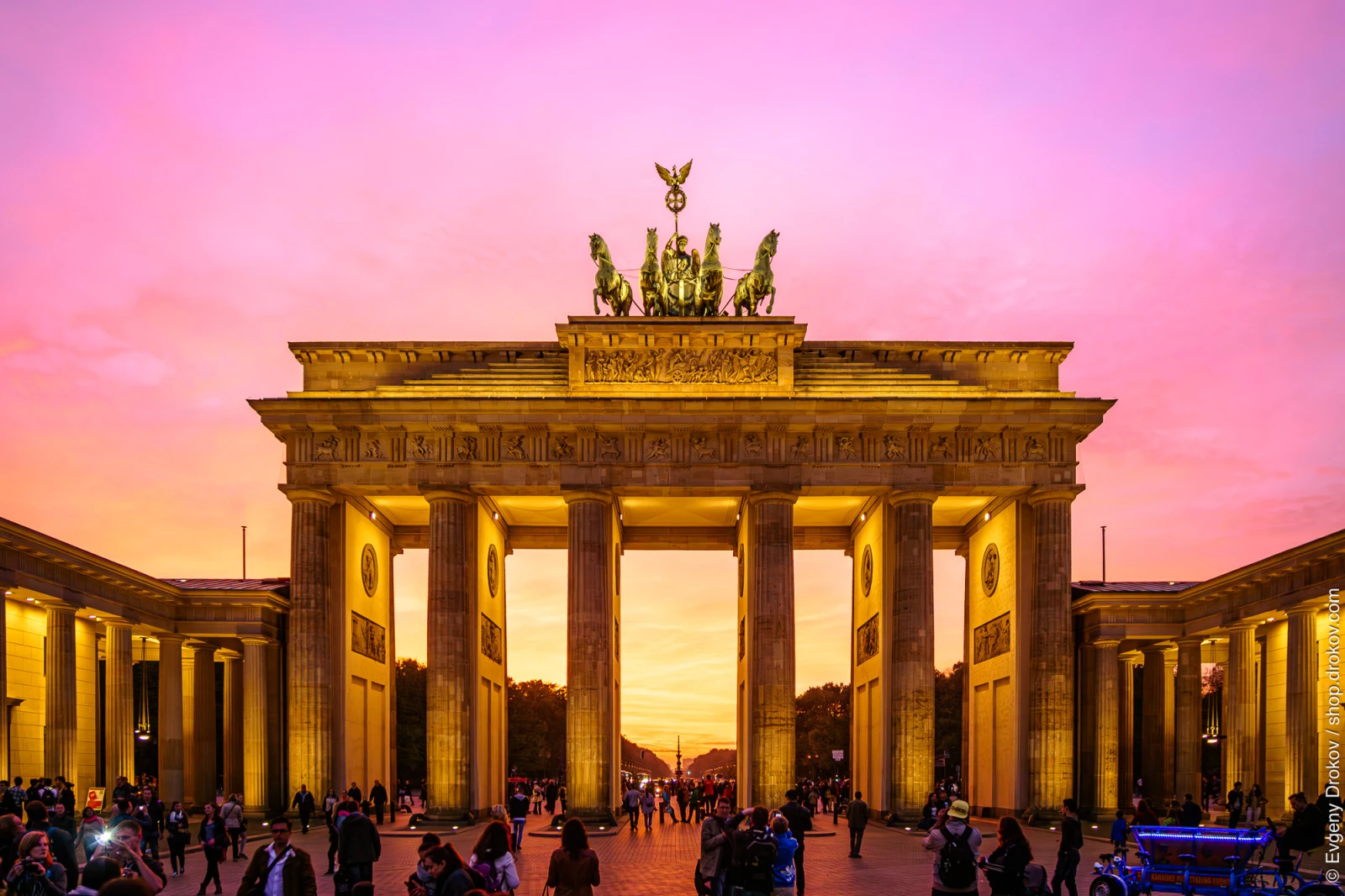 Brandenburg Gate, Berlin, Germany, October 2014. Visitors gather at this iconic landmark during a vibrant sunset, capturing the historic architecture and the city's evening ambiance.