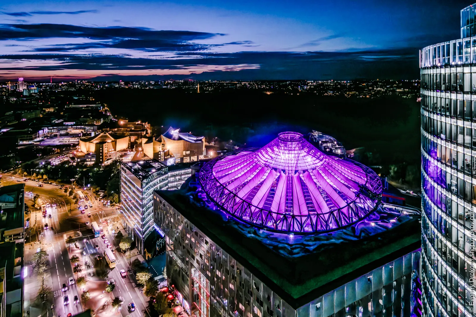 This is an aerial view of Potsdamer Platz in Berlin at dusk. The iconic Sony Center's illuminated roof glows purple, a beacon against the twilight sky. The surrounding modern architecture and bustling street traffic showcase the vibrant energy of this urban hub.