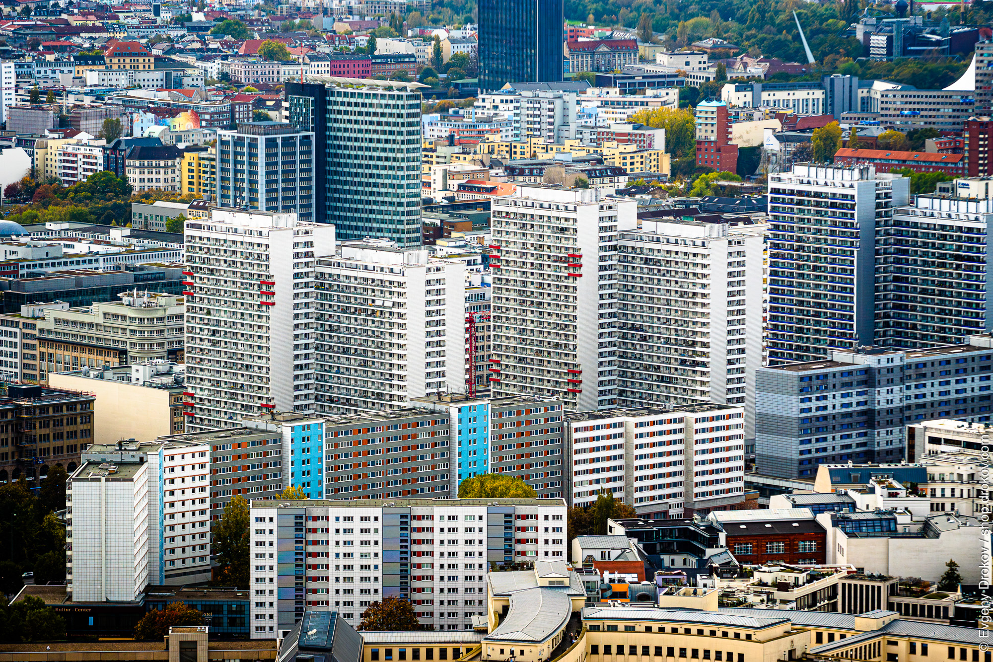 High-angle view of a dense urban landscape. Numerous apartment buildings, varying in architectural style and color, are clustered together. The image showcases the urban density and diverse building types within a city.