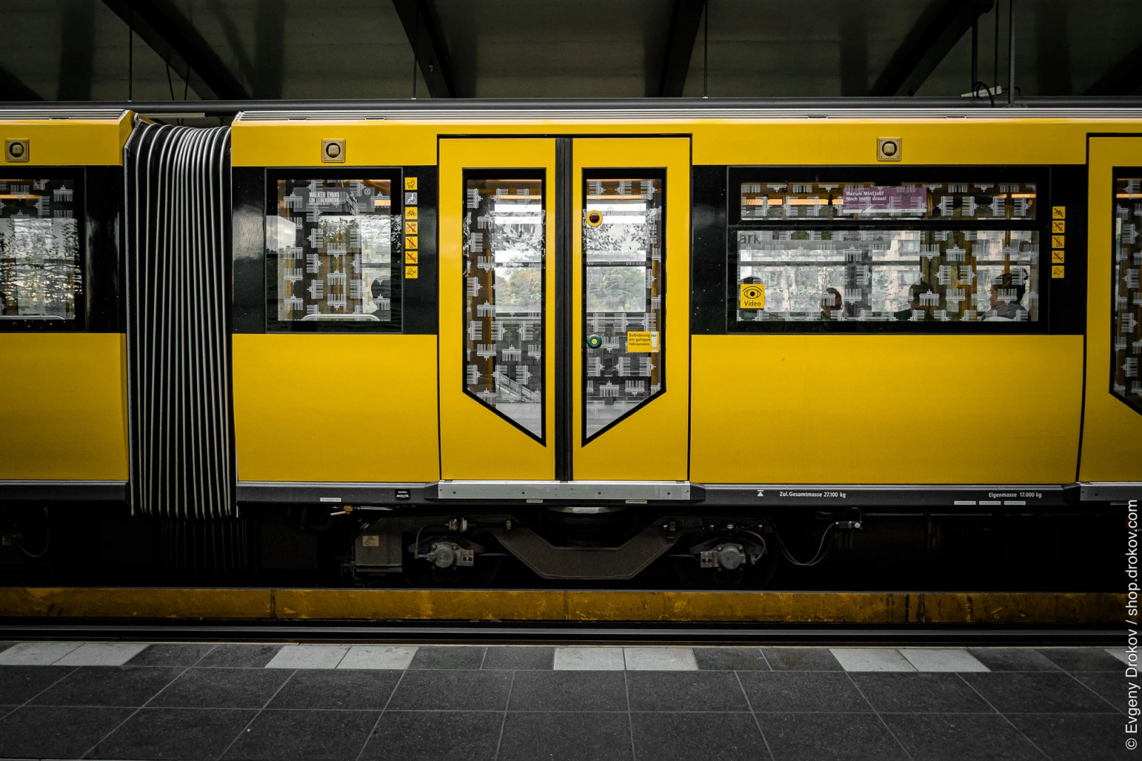 A yellow subway train is stopped at a station, with passengers visible inside. Signs on the train clearly display weight limits and rules for carrying items, ensuring safe and orderly transit for all.