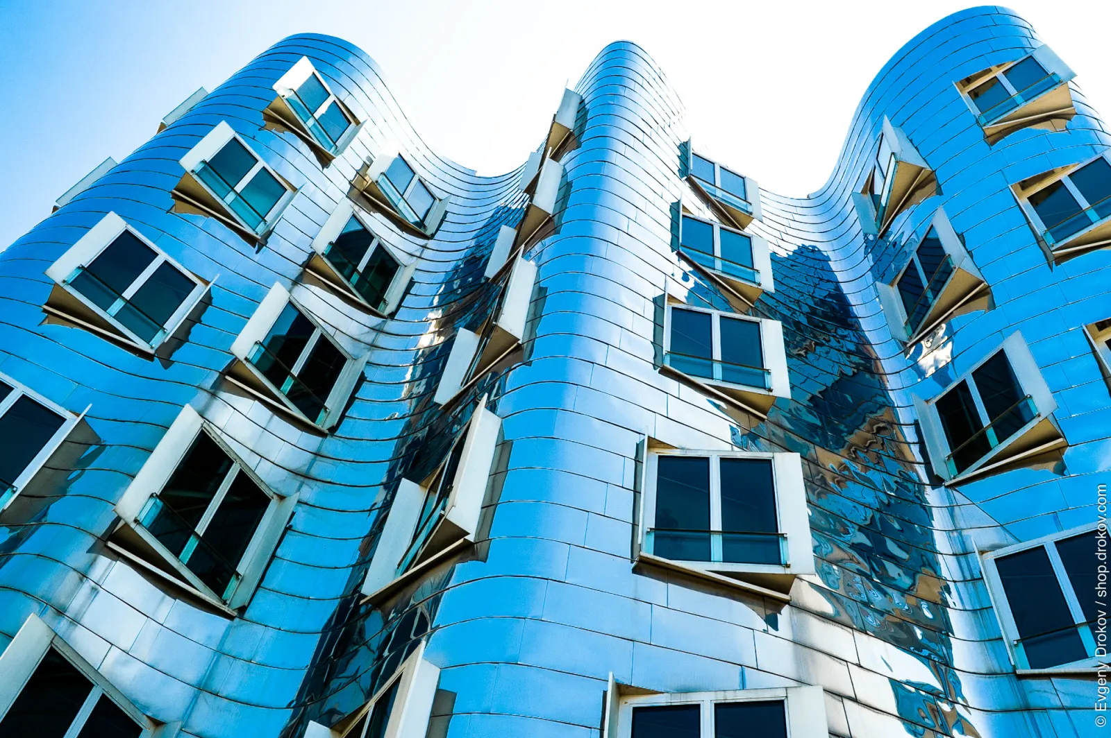 This is the Gehry Building in Düsseldorf, Germany, captured in April. The striking, undulating facade of this architectural marvel is rendered in gleaming blue metal, reflecting the sky and creating a dynamic visual effect. The building's unique design draws the eye, showcasing a bold statement in modern architecture.