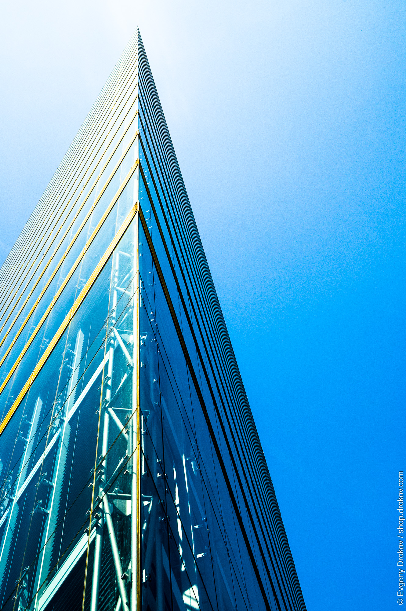 This striking architectural composition captures the sharp lines of a modern glass building against a clear blue sky in Düsseldorf, Germany, during April. The upward angle emphasizes the building's height and geometric form, showcasing its reflective facade.