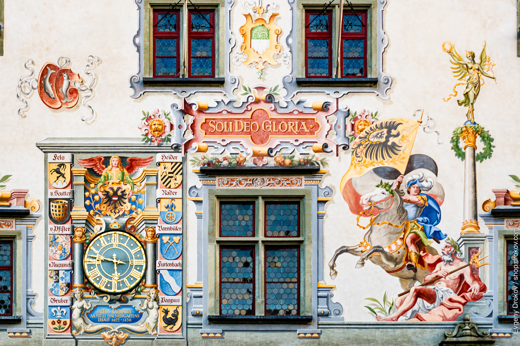 This detailed mural, located in Lindau, Germany, showcases historical coats of arms and allegorical figures. The artwork, created in February 2016, celebrates the rich heritage of the region.