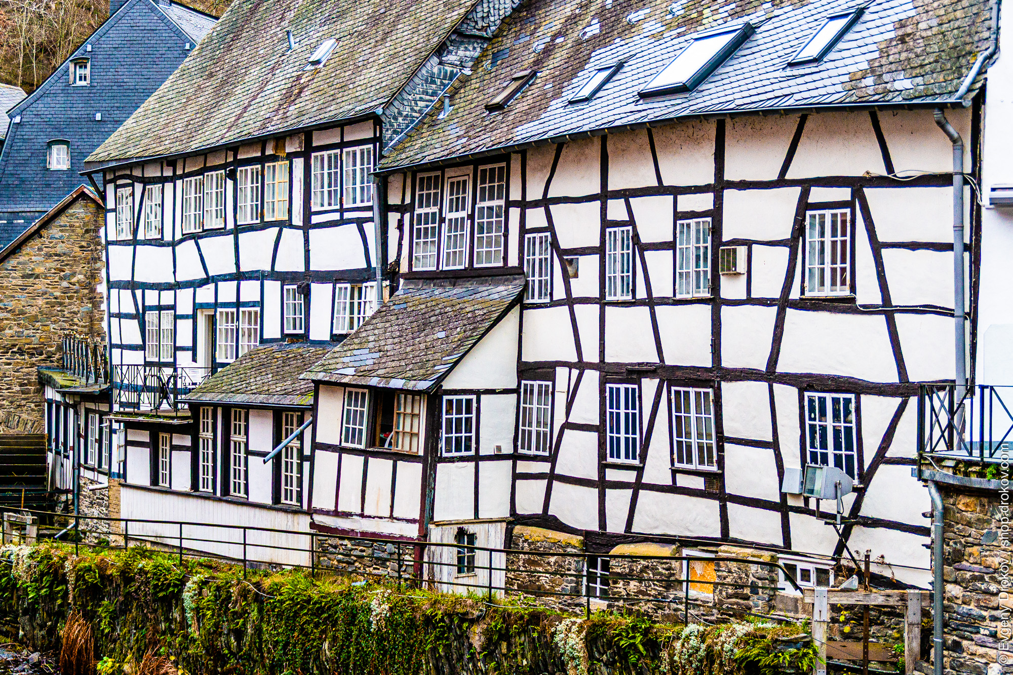 This is a view of historic half-timbered buildings in Monschau, Germany. The architecture showcases traditional German construction, highlighting the town's rich heritage and picturesque charm.