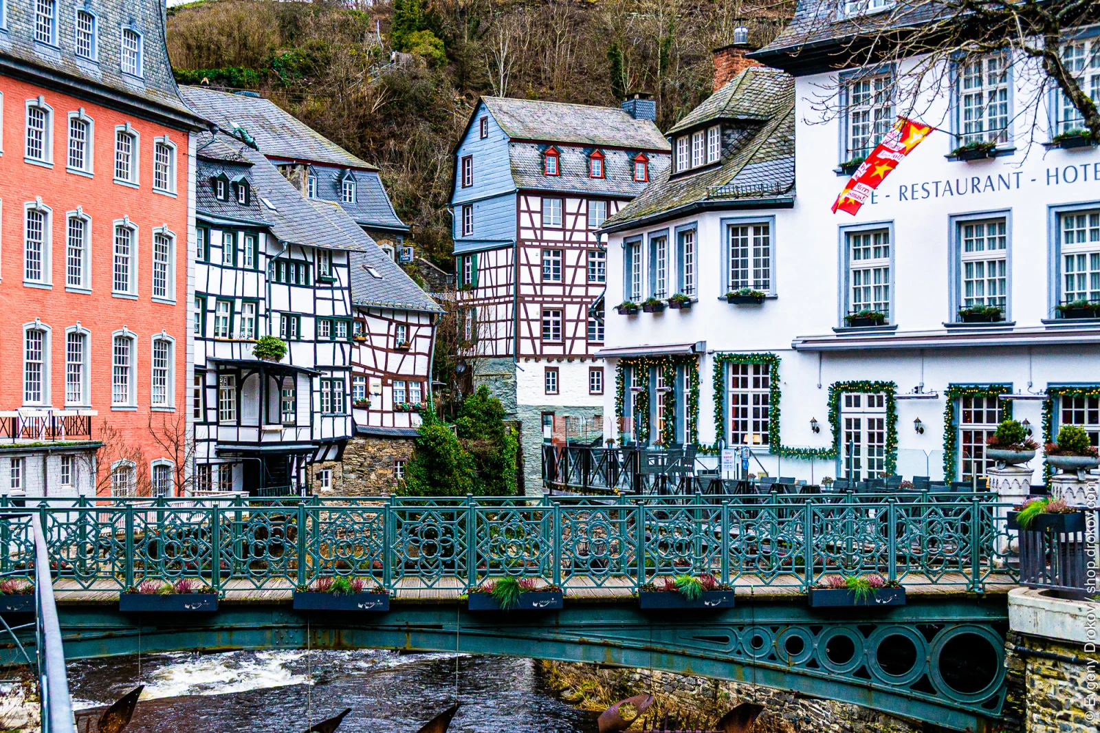 The historic town of Monschau, Germany, is captured here, showcasing its charming half-timbered buildings and picturesque river. The festive decorations on the restaurant and hotel indicate a holiday celebration, drawing visitors to experience the town's unique atmosphere.