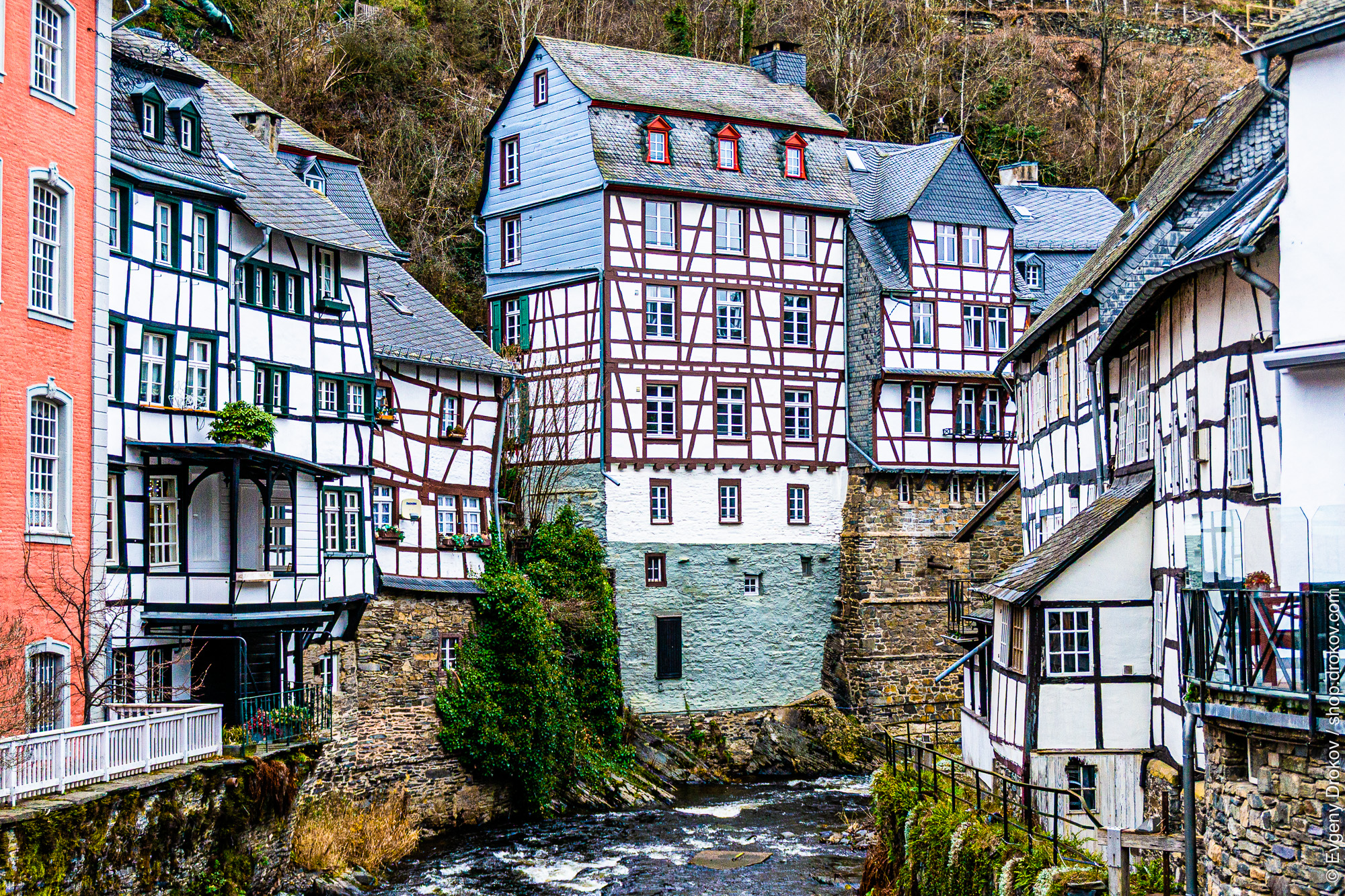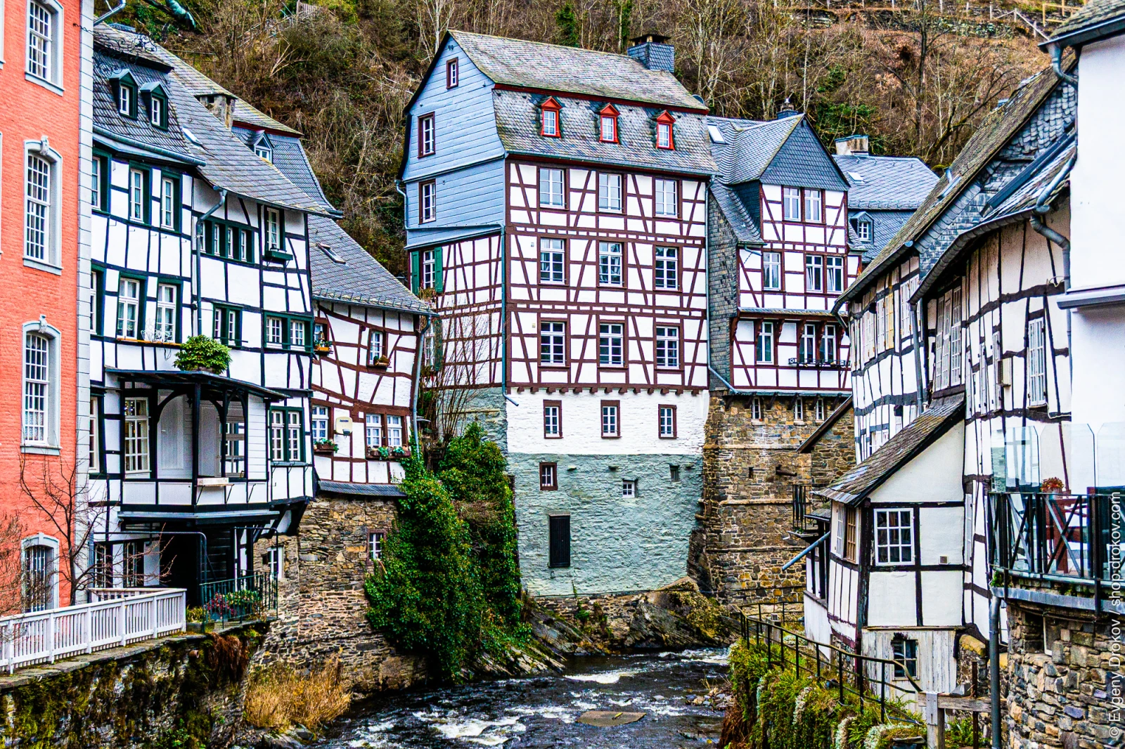Historic half-timbered buildings line the rushing river in Monschau, Germany. This picturesque town showcases centuries of architectural heritage, drawing visitors to its charming streets and unique riverside setting.