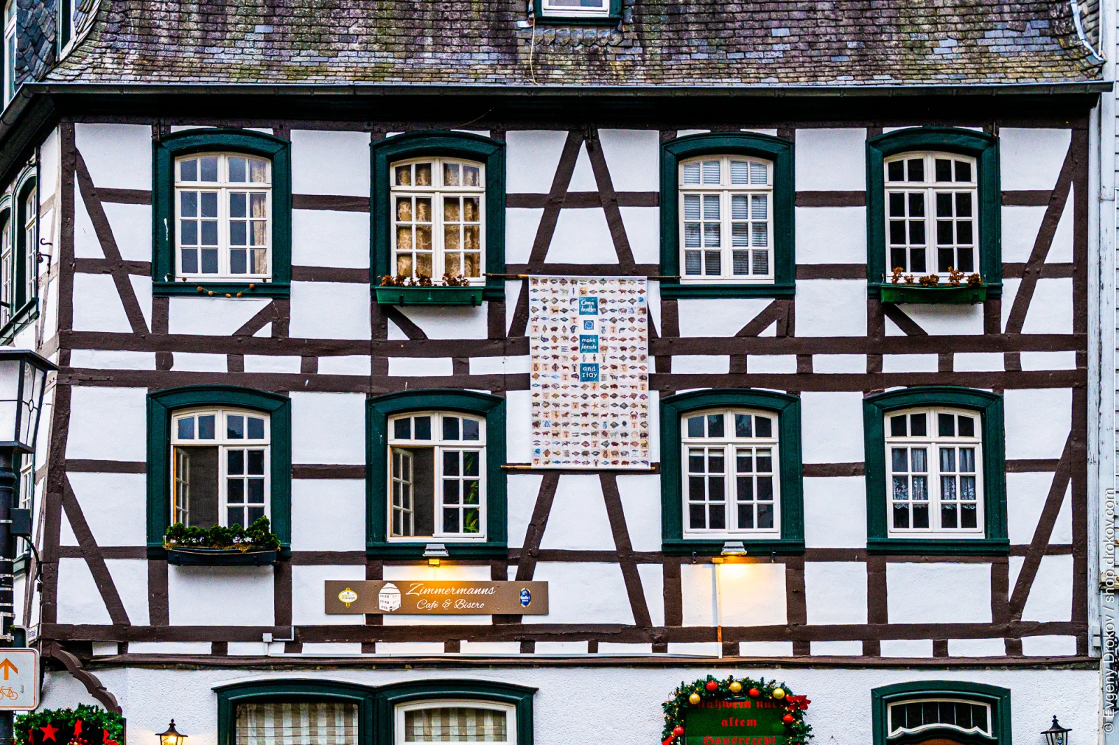 This is Zimmermanns Café & Bistro in Monschau, Germany. The establishment is decorated for the holidays, showcasing its festive atmosphere and inviting patrons to enjoy its offerings.
