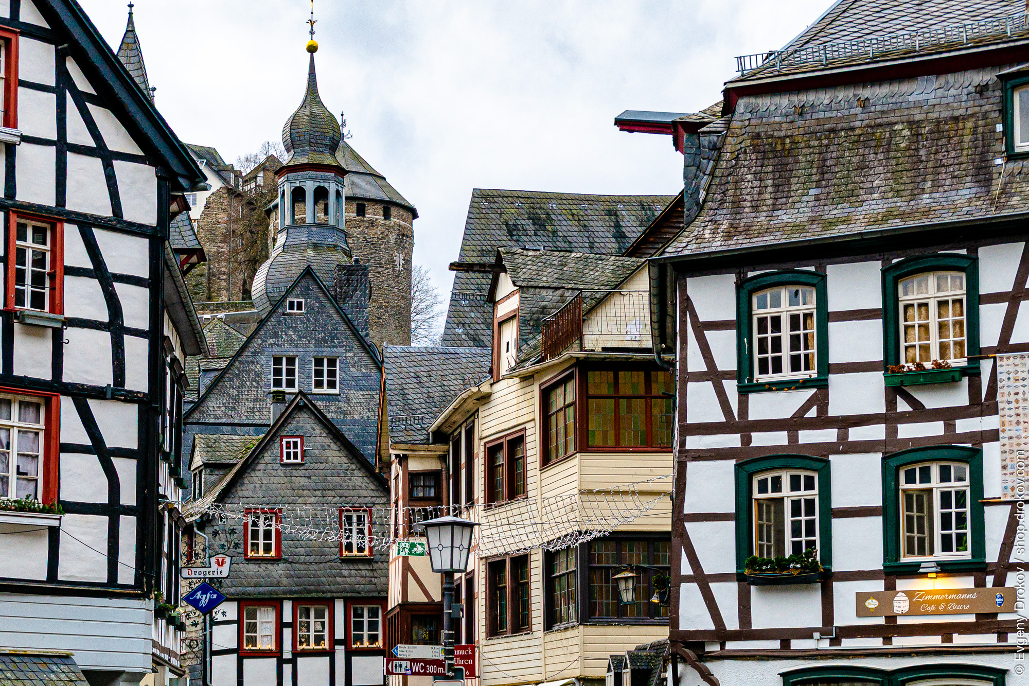 The historic half-timbered buildings of Monschau, Germany, stand proudly under a cloudy sky. This architectural charm captures the essence of this picturesque town, inviting exploration and appreciation of its rich heritage.