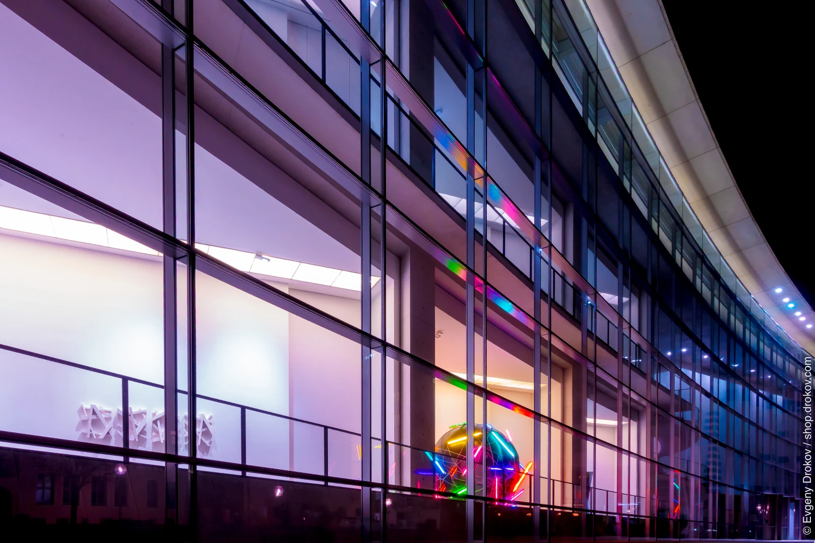 This is a modern building in Nuremberg, Bavaria, Germany, illuminated by festive Christmas lights. The vibrant colors reflect off the glass facade, creating a dynamic and festive atmosphere.