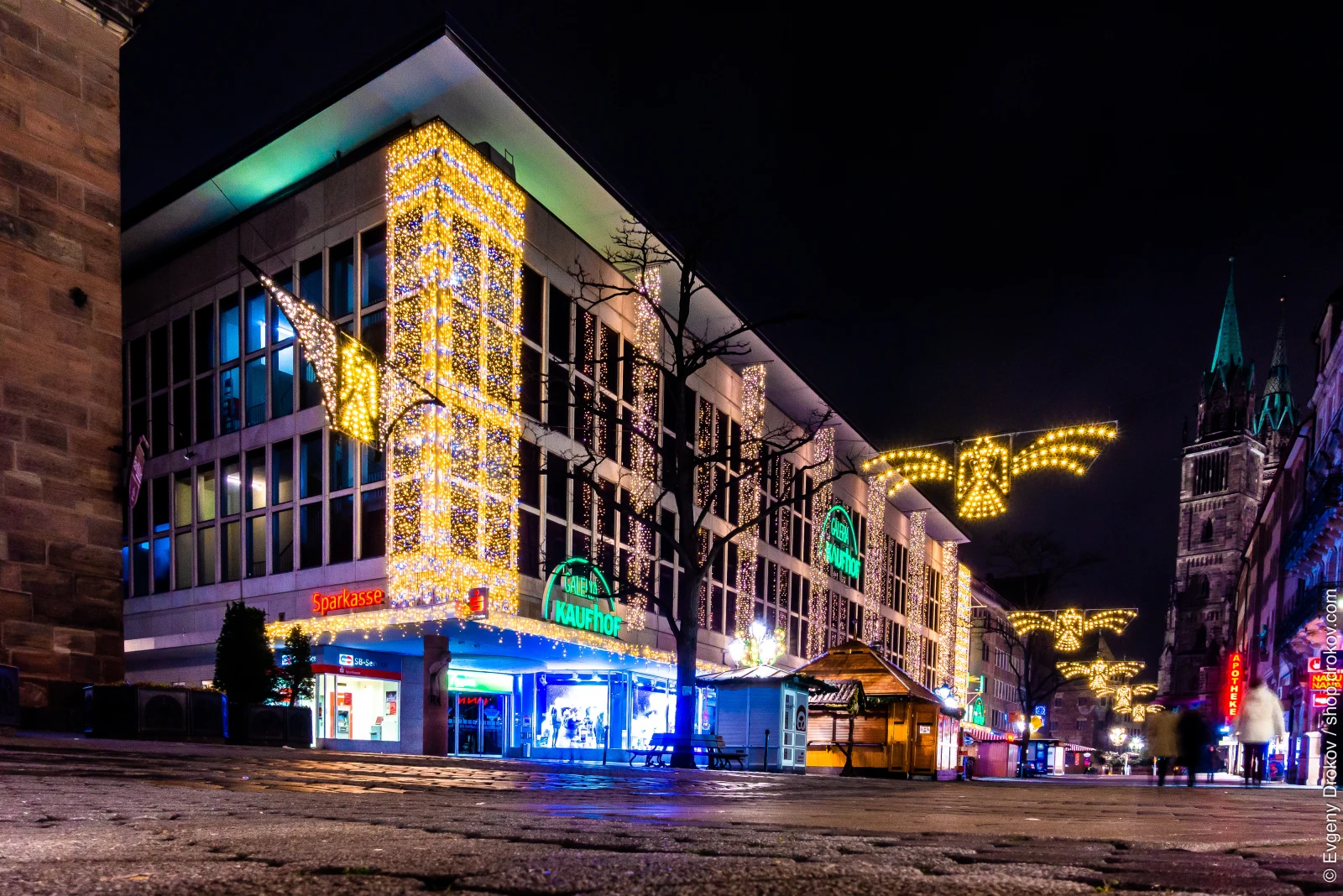 Nuremberg, Germany, is illuminated by festive Christmas lights adorning buildings and streets. The vibrant display captures the essence of the holiday season, drawing people to experience the magical atmosphere of the city's Christmas market.