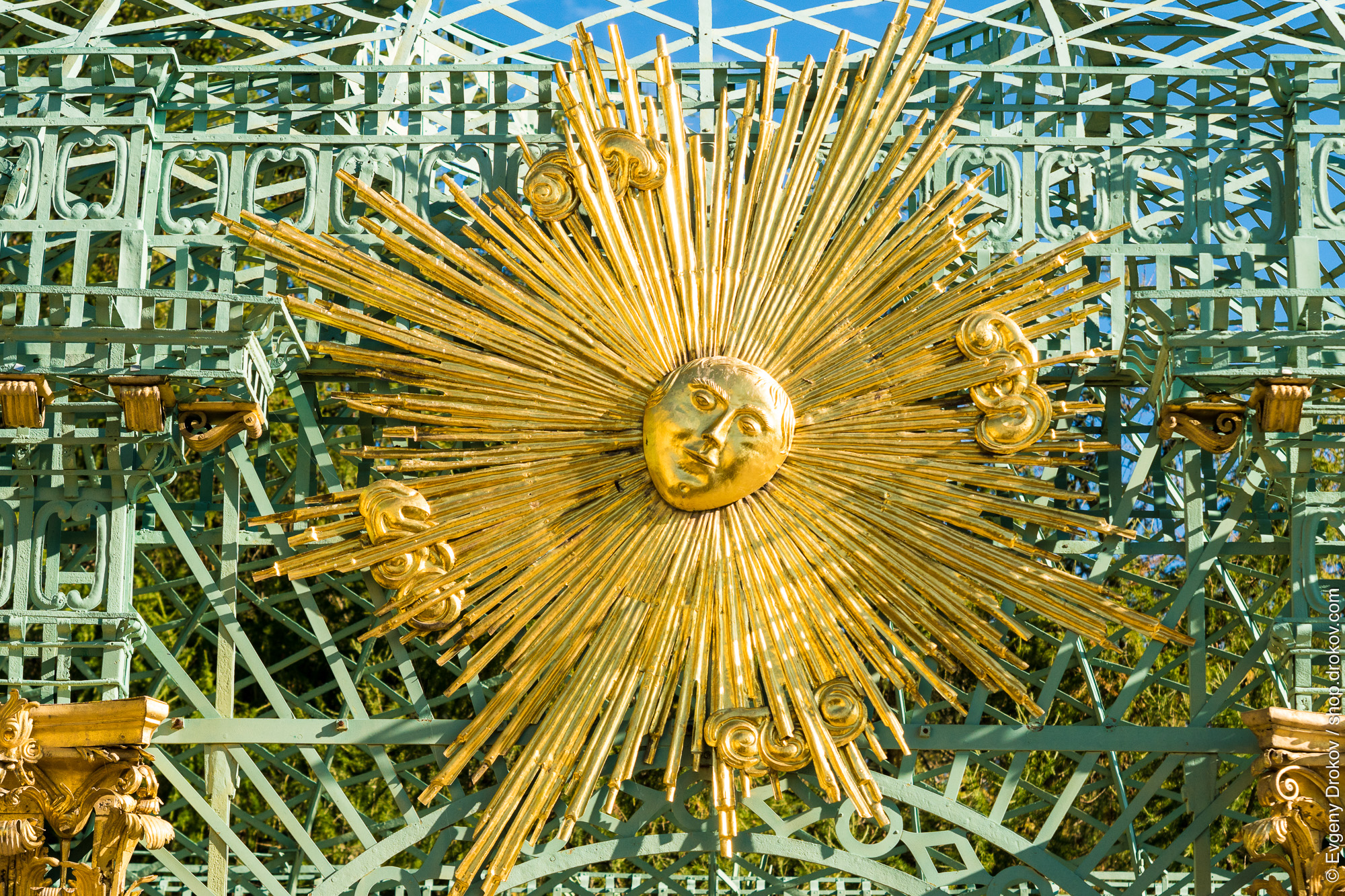 This is a close-up of a golden sunburst ornament on a green metal gate in Potsdam, Germany, captured in October 2014. The intricate detail of the sun's face and rays against the geometric pattern of the gate showcases the artistry of the period.