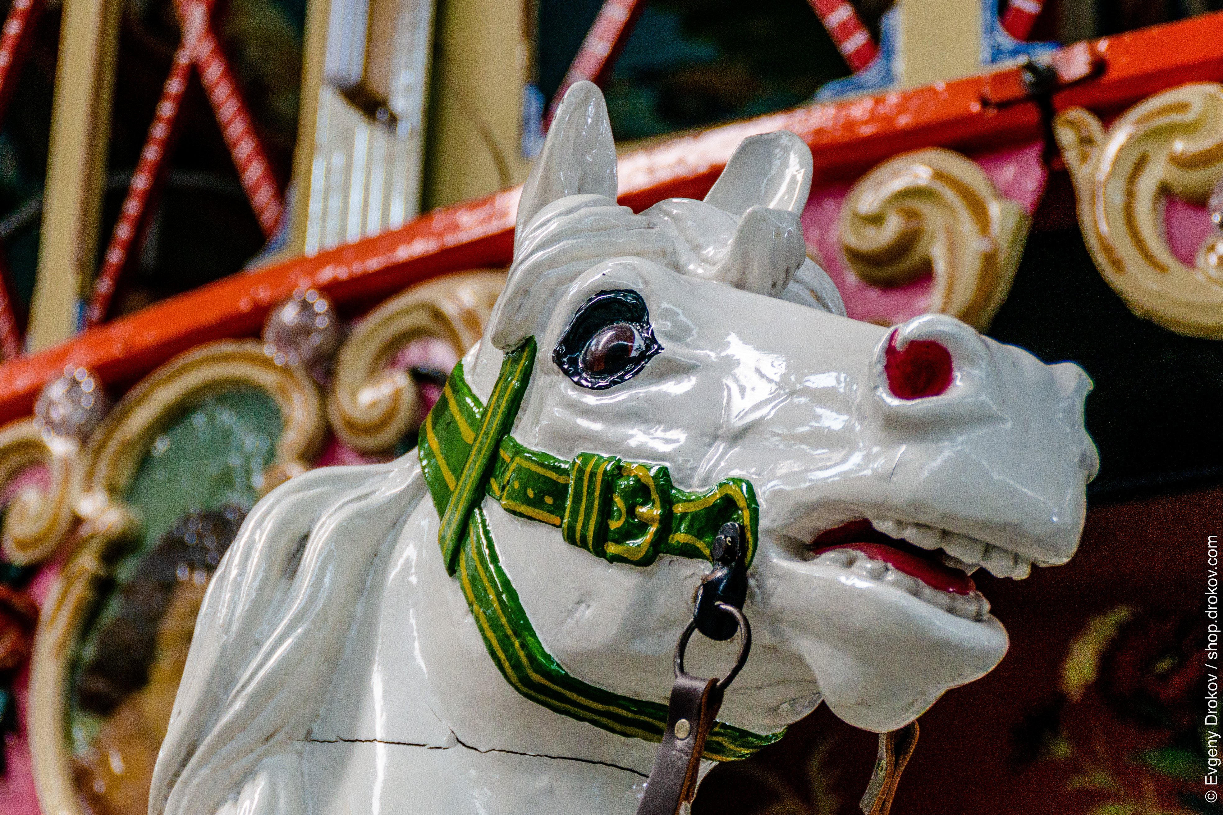 A white carousel horse, adorned with a green and yellow bridle, stands ready for riders at the Technik Museum Speyer in Germany. This classic attraction offers a nostalgic journey for visitors of all ages.