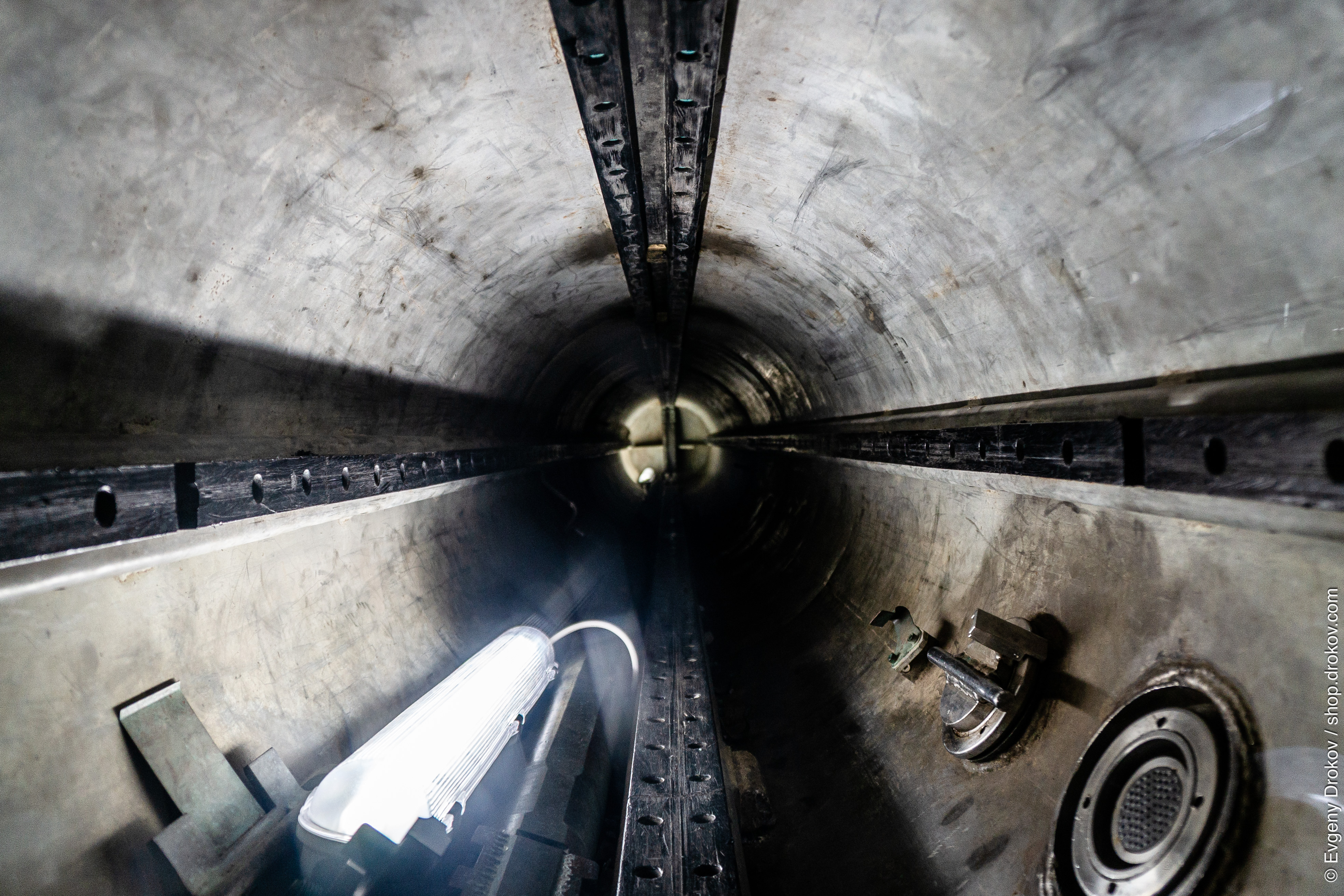 Inside the Technik Museum Speyer in Germany, a bright industrial light illuminates the metallic interior of a tunnel. This perspective captures the raw engineering and scale of the exhibit, offering a glimpse into the museum's collection of technological marvels.