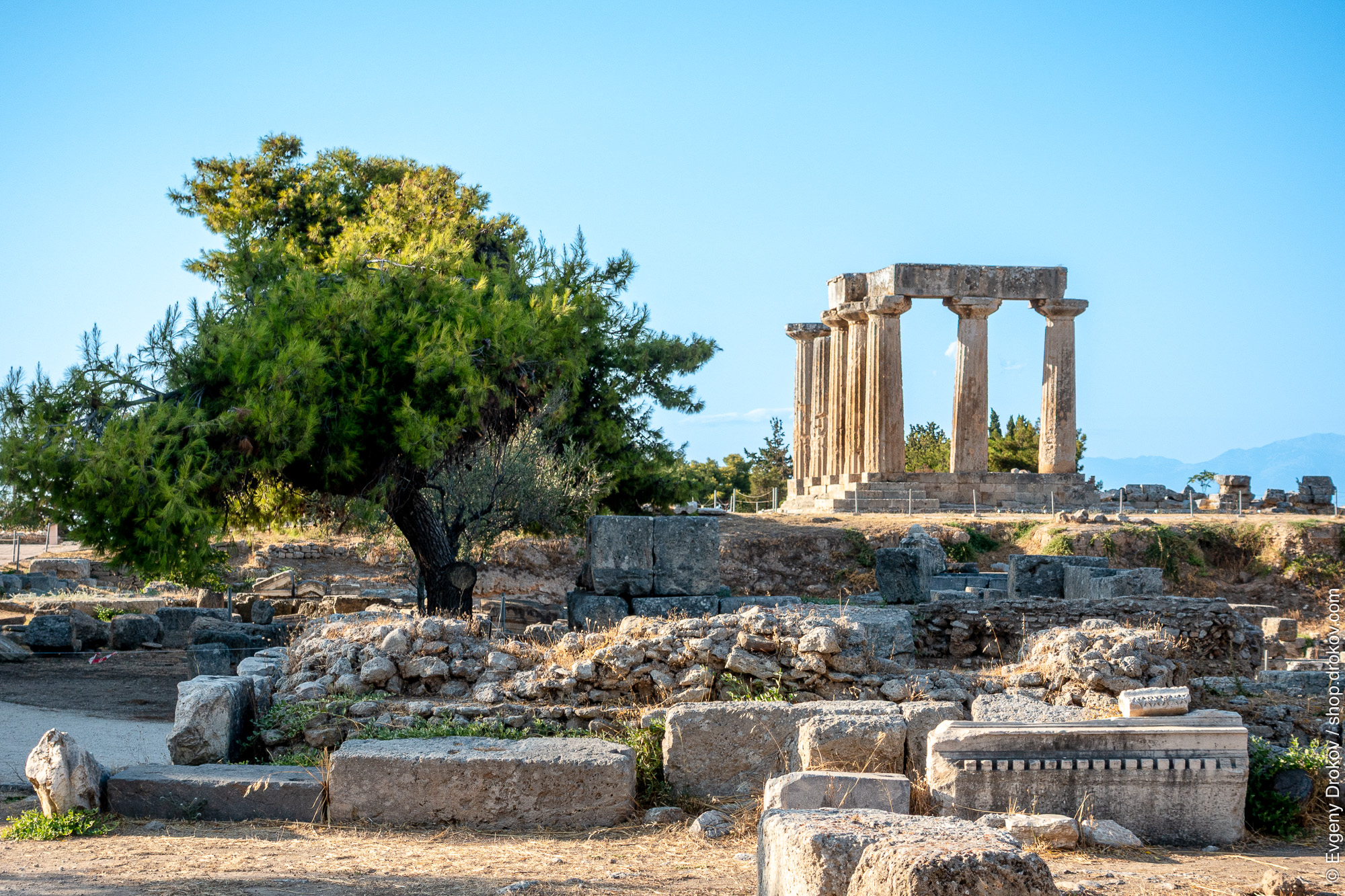 Ancient ruins stand testament to history in Corinth, Greece. The remnants of a temple, with its imposing columns, are bathed in sunlight, inviting contemplation of a bygone era.