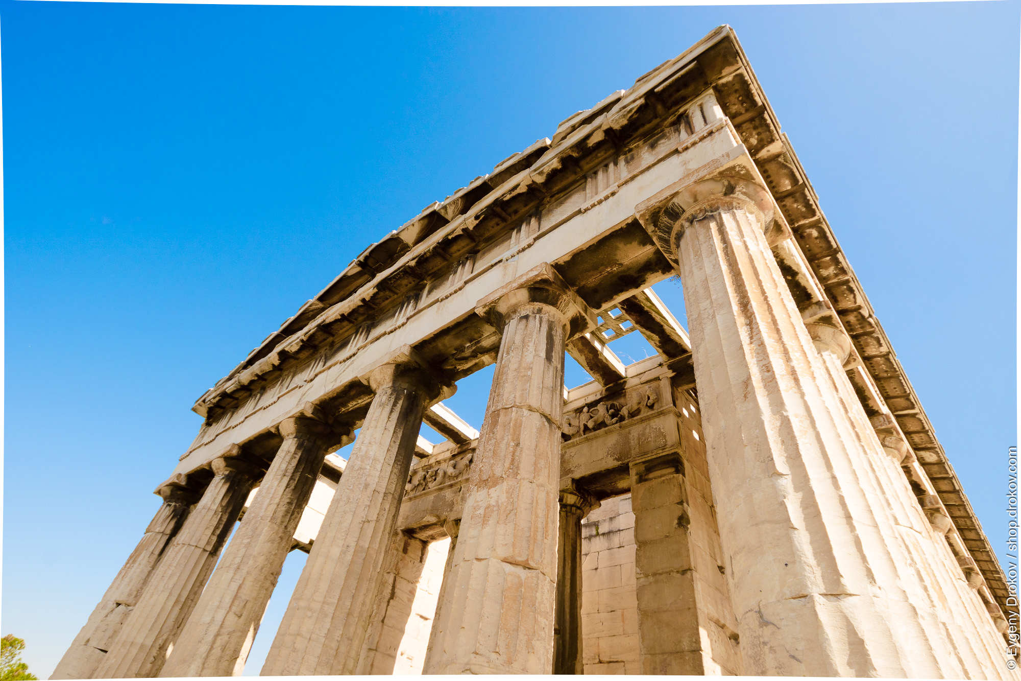 This is the Erechtheion, an ancient Greek temple in Athens, Greece. The structure's intricate columns and architectural details are showcased against a clear blue sky, highlighting its enduring design and construction.