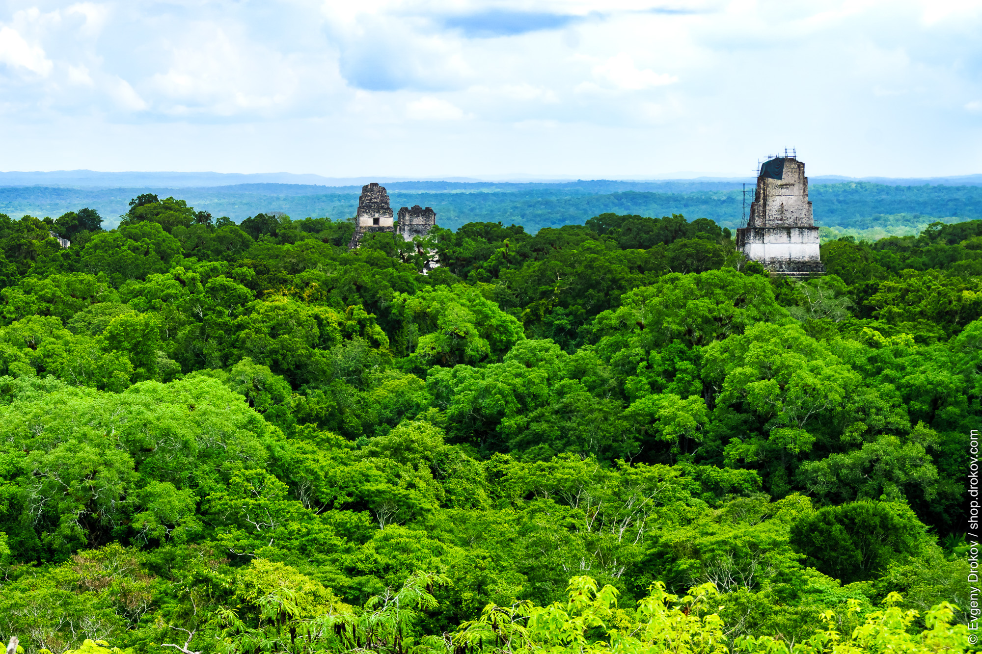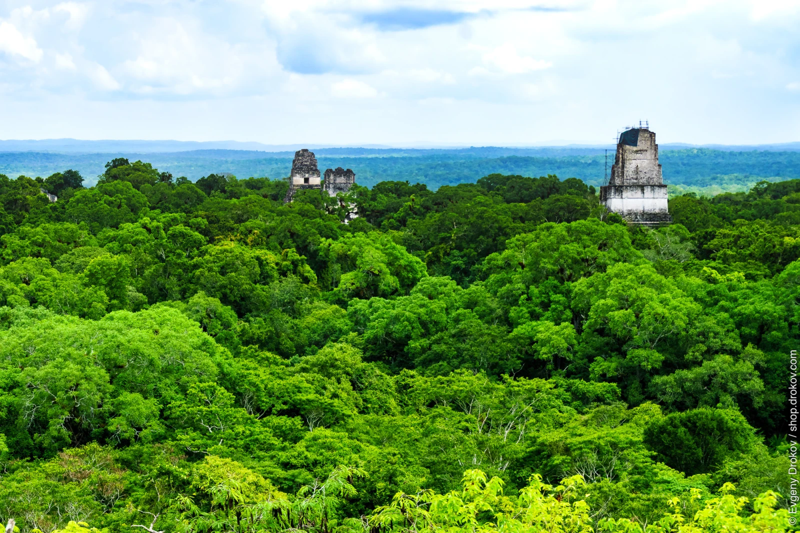 Ancient Mayan pyramids emerge from the dense jungle canopy at Tikal, Guatemala. This UNESCO World Heritage site showcases the architectural grandeur of a lost civilization, preserved within the vibrant rainforest.