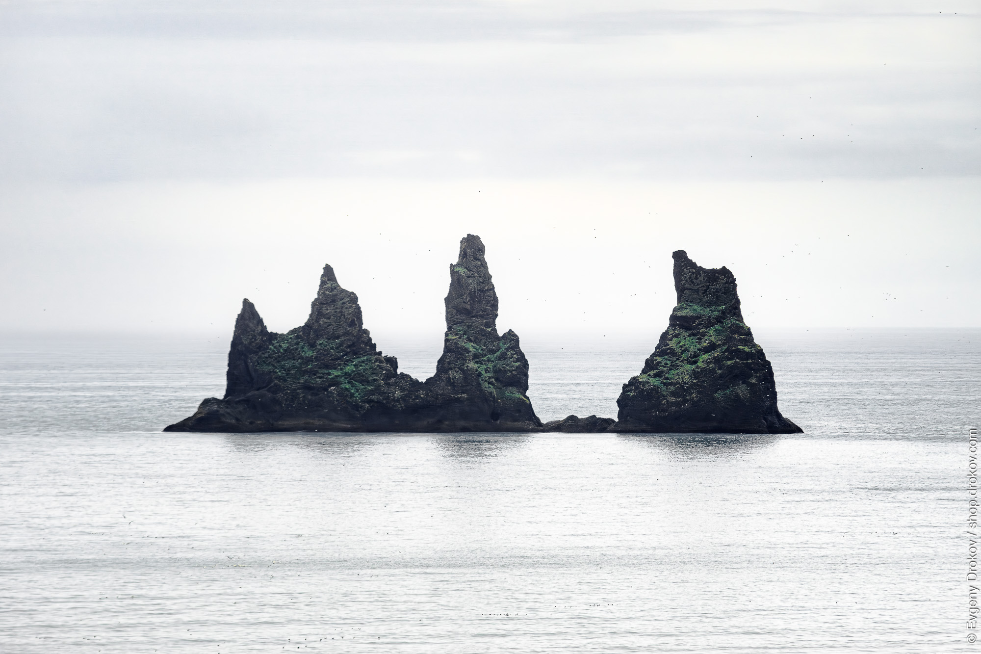 Dramatic dark basalt rock formations emerge from a calm grey sea in Iceland. The overcast sky and the birds in flight complete the scene. Nature's artistry is on full display.