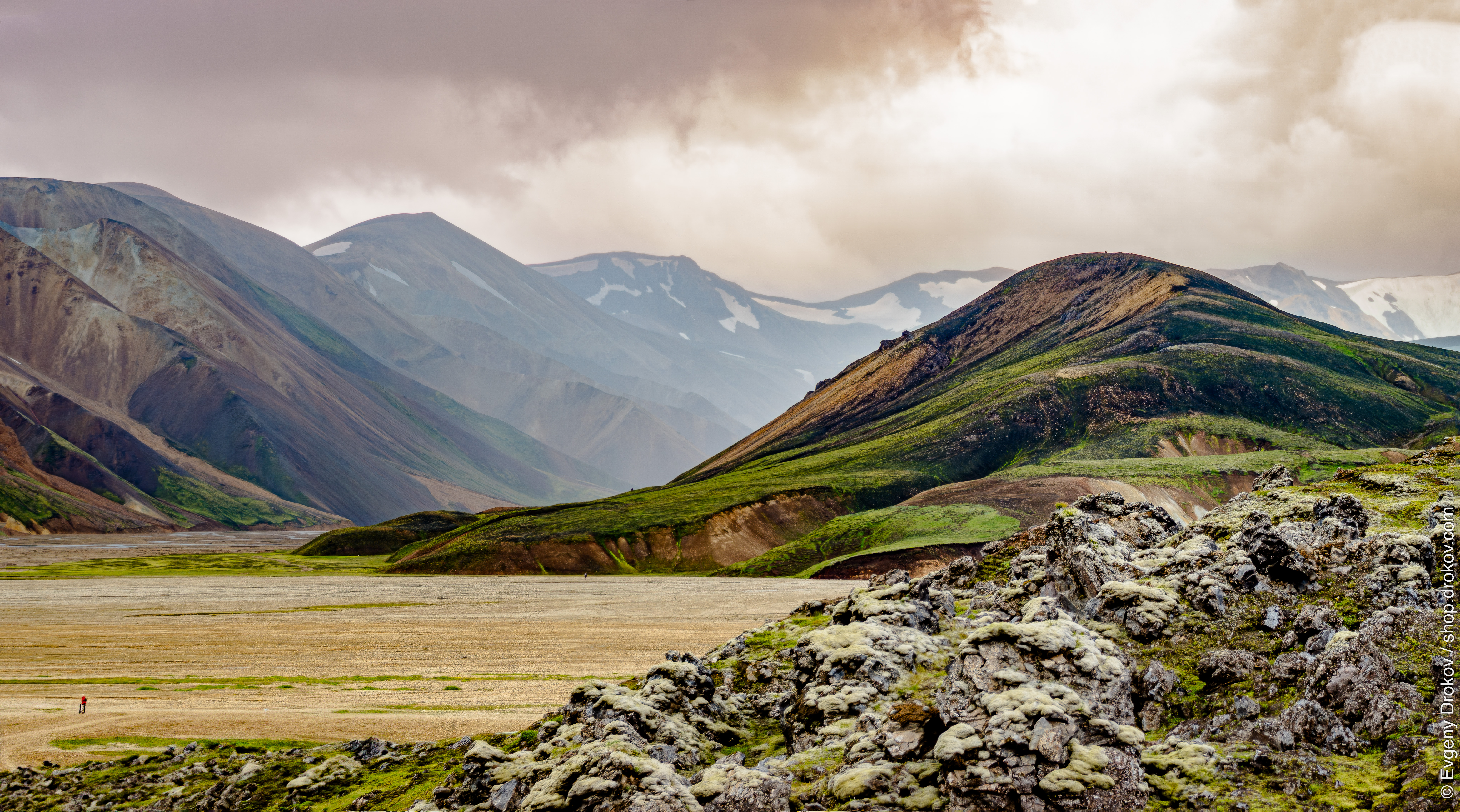 A hiker navigates a dramatic Icelandic landscape. Vast, colorful mountains, sculpted by nature, dominate the scene. The rugged terrain, a testament to the raw power of the earth, is a breathtaking sight.