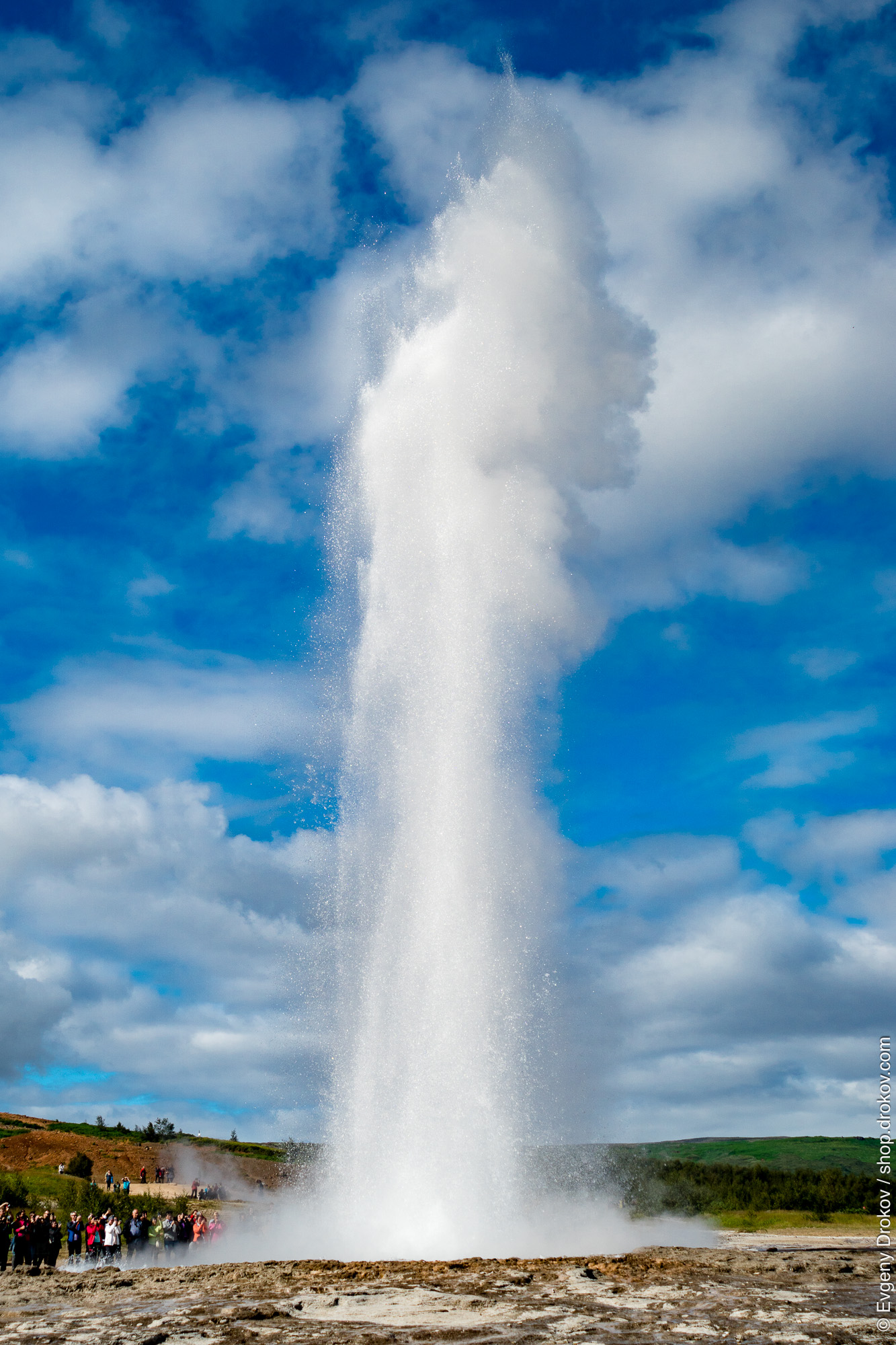 Witness the raw power of nature as Strokkur geyser erupts in Iceland's Geysir region. This geothermal marvel, captured in August 2017, draws crowds eager to experience its spectacular display.