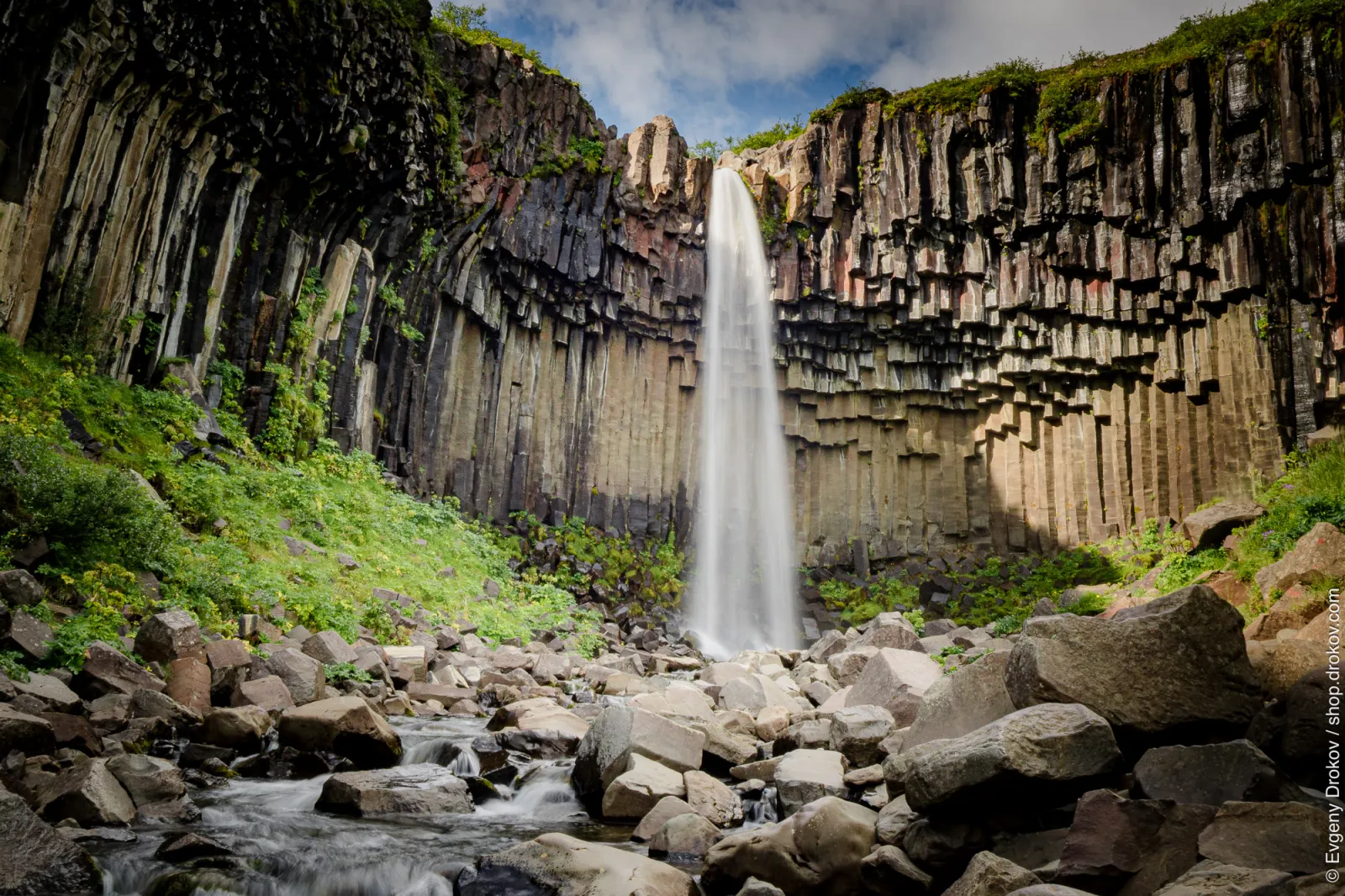 Svartifoss waterfall cascades over basalt columns in Sveitarfélagið Hornafjörður, Iceland, during August 2017. This natural wonder showcases Iceland's dramatic geological formations.
