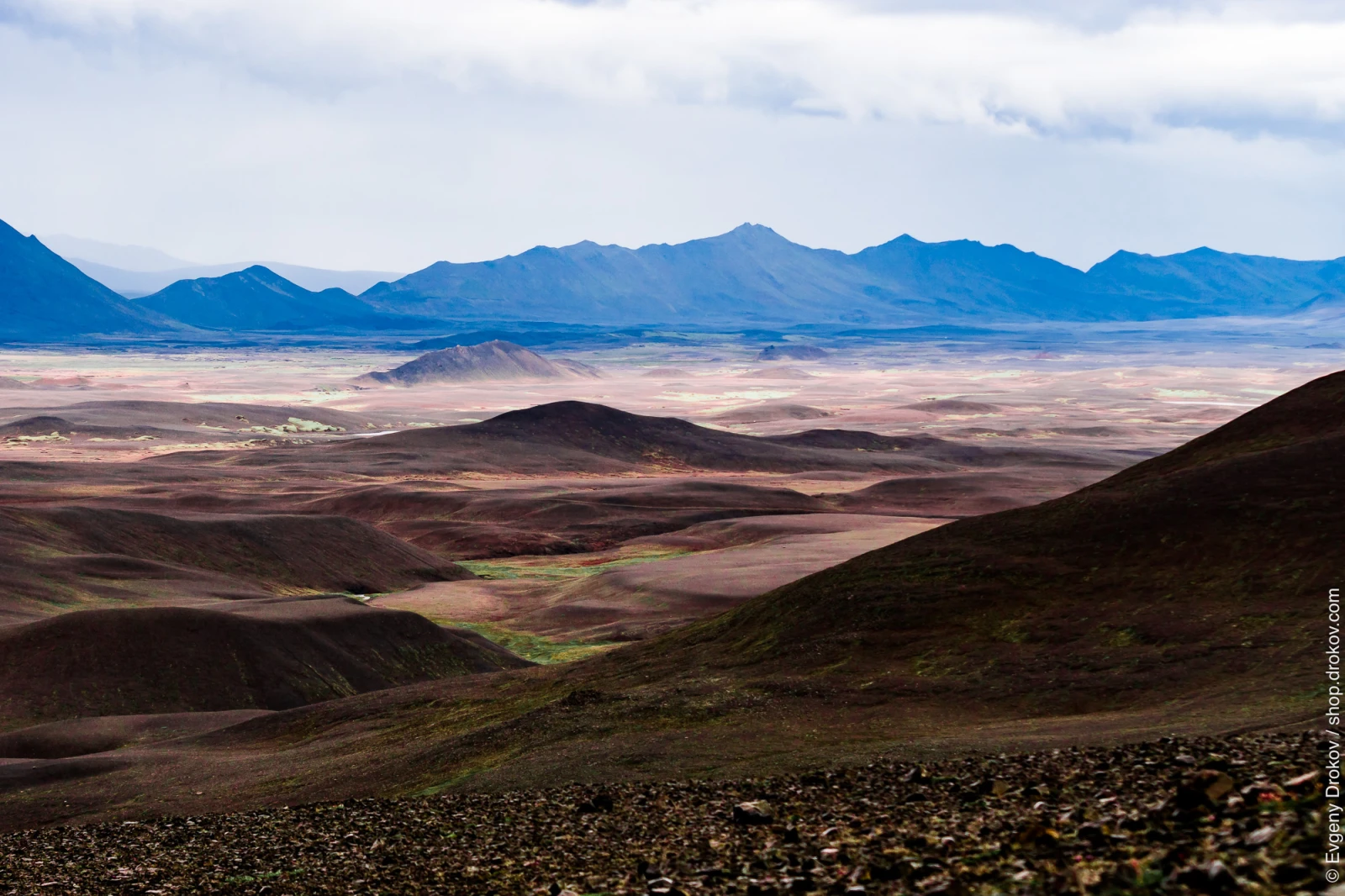This expansive vista captures the rugged terrain of Fljótsdalshérað, Iceland, along the F905 road leading to the Askja volcano. Taken in August 2017, the composition showcases the dramatic, undulating landscape under a cloudy sky, inviting exploration of this remote and powerful natural environment.