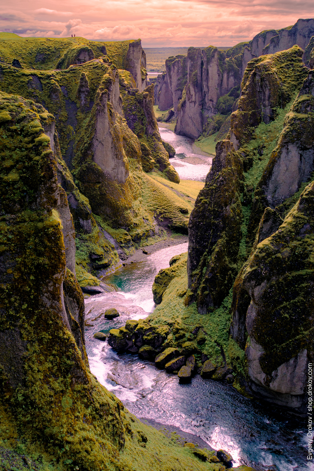 Two figures stand atop the moss-covered cliffs of Fjaðrárgljúfur canyon in Skaftárhreppur, Iceland. They are witnessing the breathtaking, ancient geological formation carved by the Fjaðrá river, a testament to nature's enduring power.