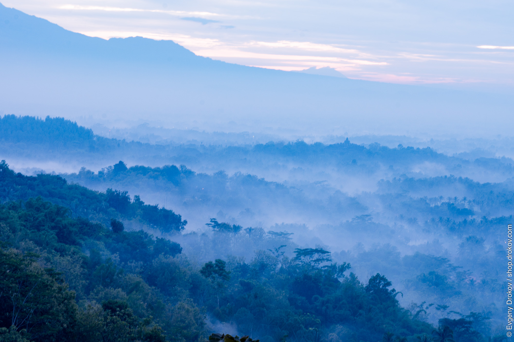 Misty dawn breaks over the lush hills of Magelang, Central Java, Indonesia. The ethereal blue haze shrouds the landscape, hinting at the ancient grandeur of Borobudur, a UNESCO World Heritage site, nestled within this serene vista. This capture evokes the tranquil beauty and spiritual aura of the region.