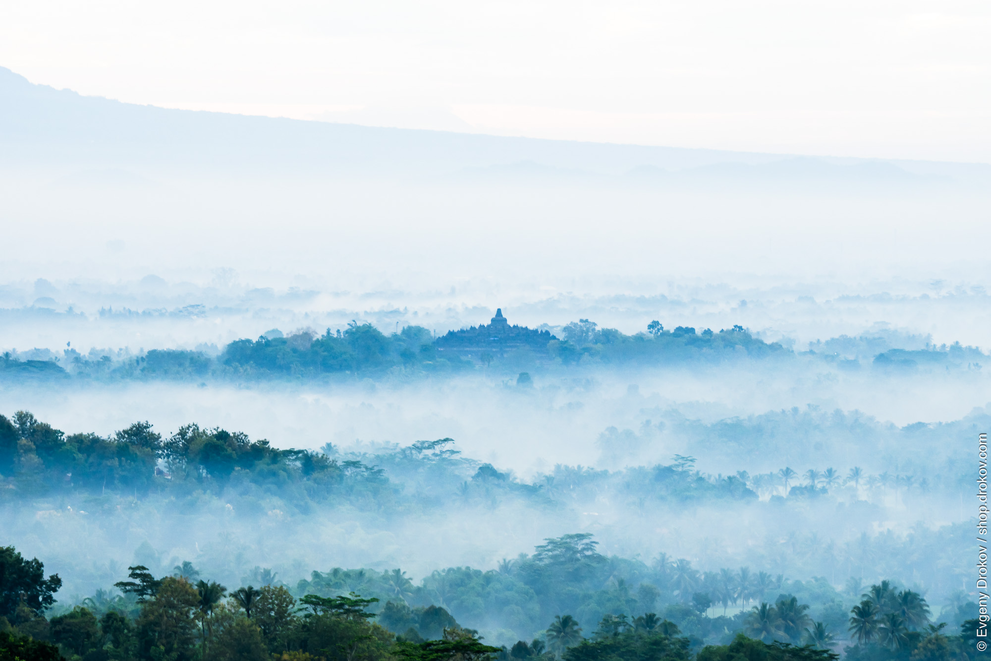 Borobudur temple, a UNESCO World Heritage site in Magelang, Central Java, Indonesia, emerges from the morning mist. This ancient Buddhist monument, a marvel of Javanese architecture and spirituality, is captured in the soft light of dawn.
