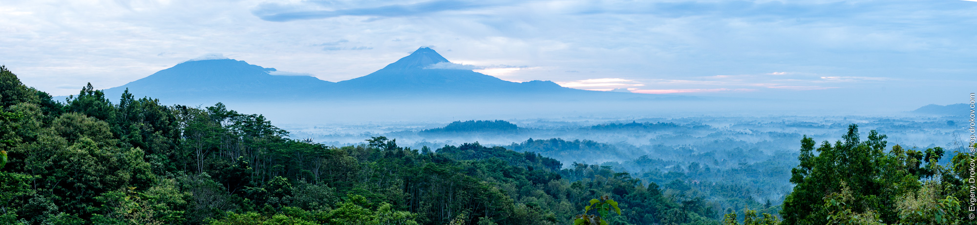 This panoramic vista captures the majestic volcanoes of Mount Merapi and Mount Merbabu in Central Java, Indonesia, at dawn. The ethereal mist blanketing the landscape evokes a sense of profound tranquility and the raw power of nature.