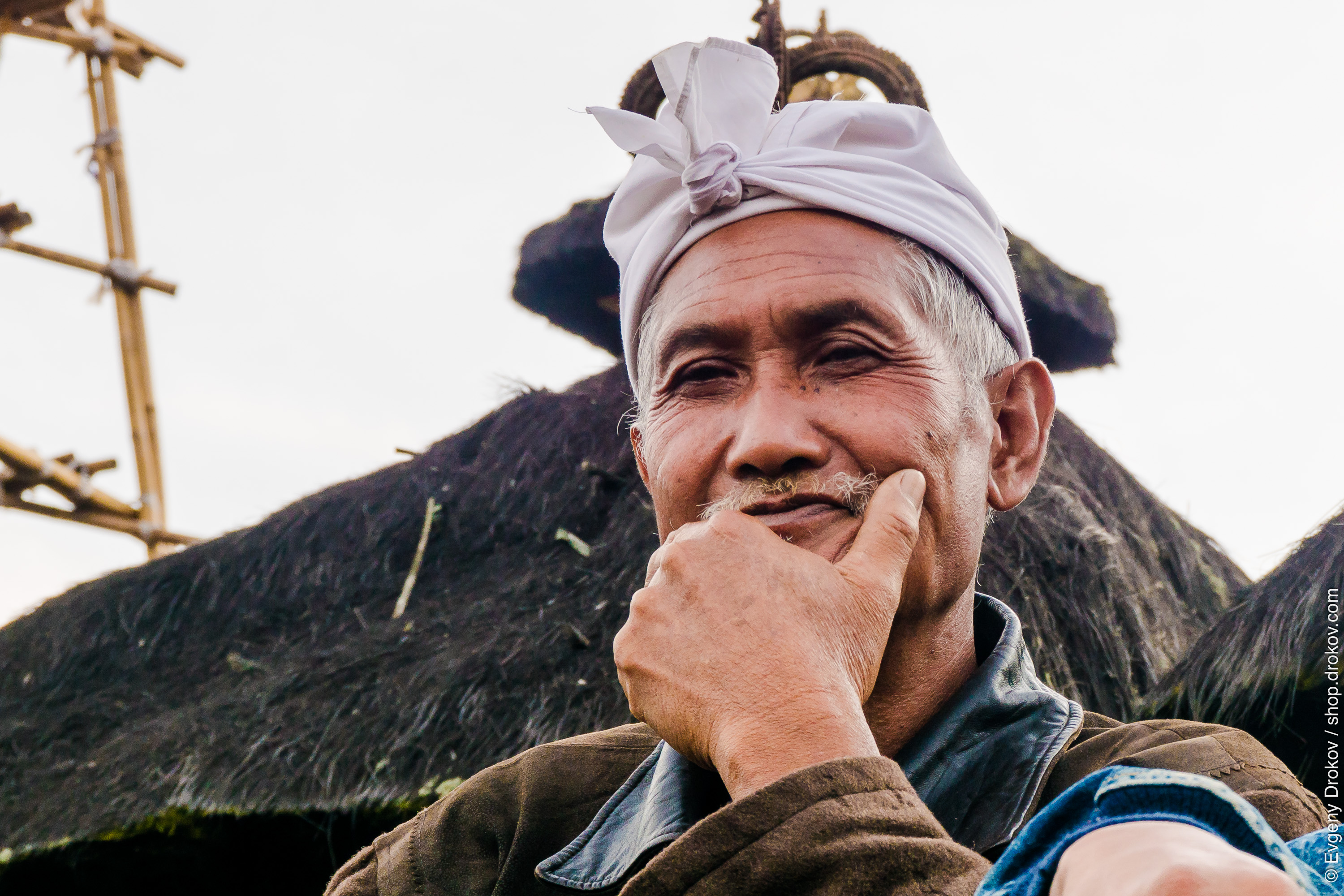 A thoughtful Balinese elder, adorned in traditional white headwear, rests against a thatched-roof structure. His posture and expression convey a sense of contemplation and deep connection to his surroundings.